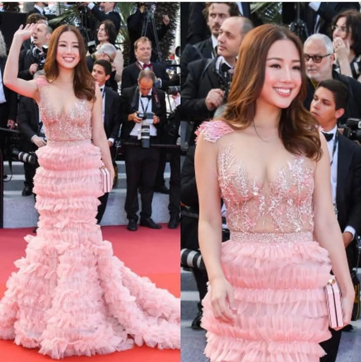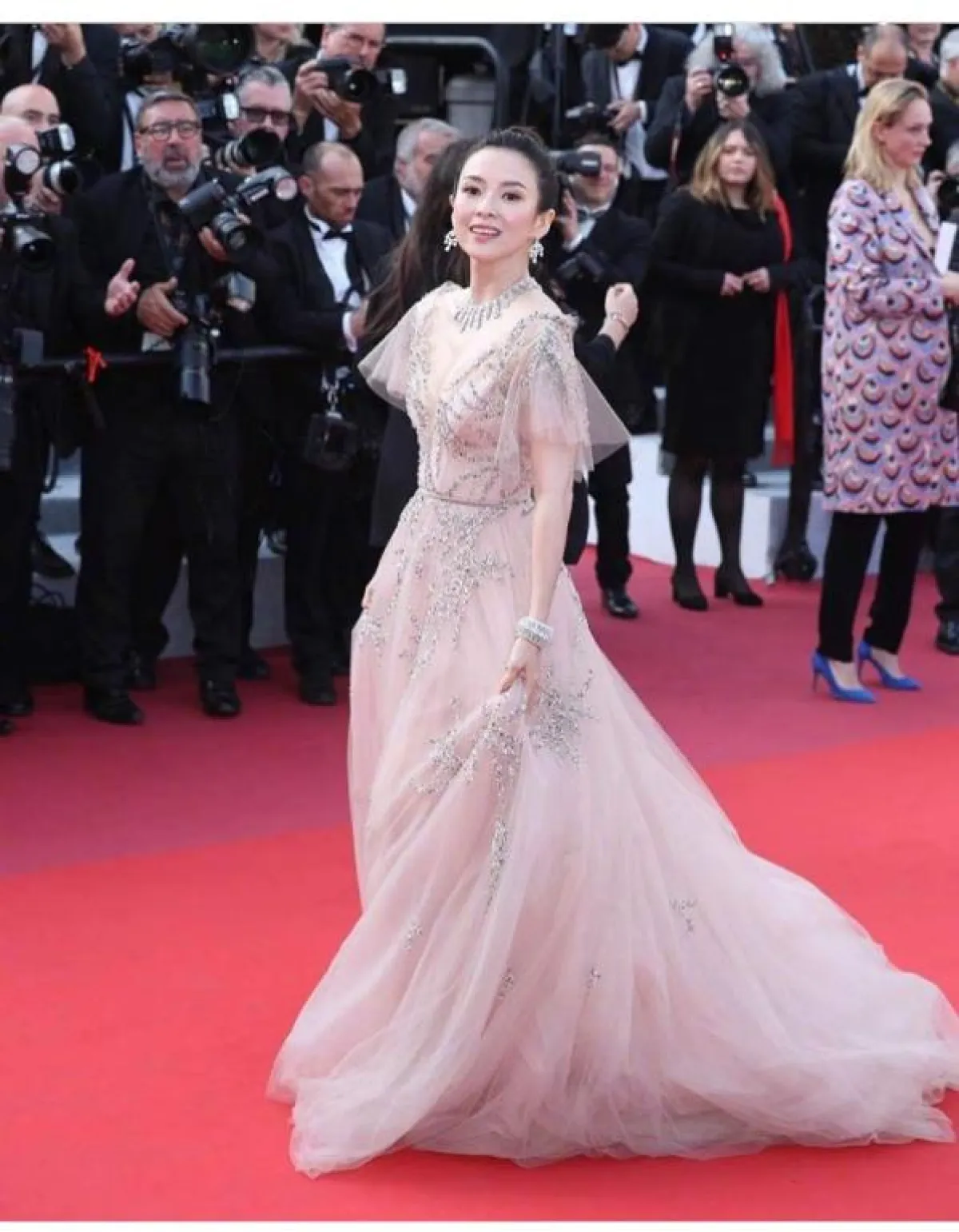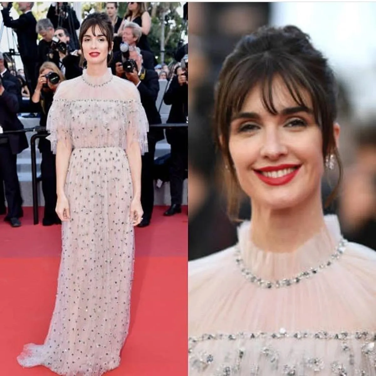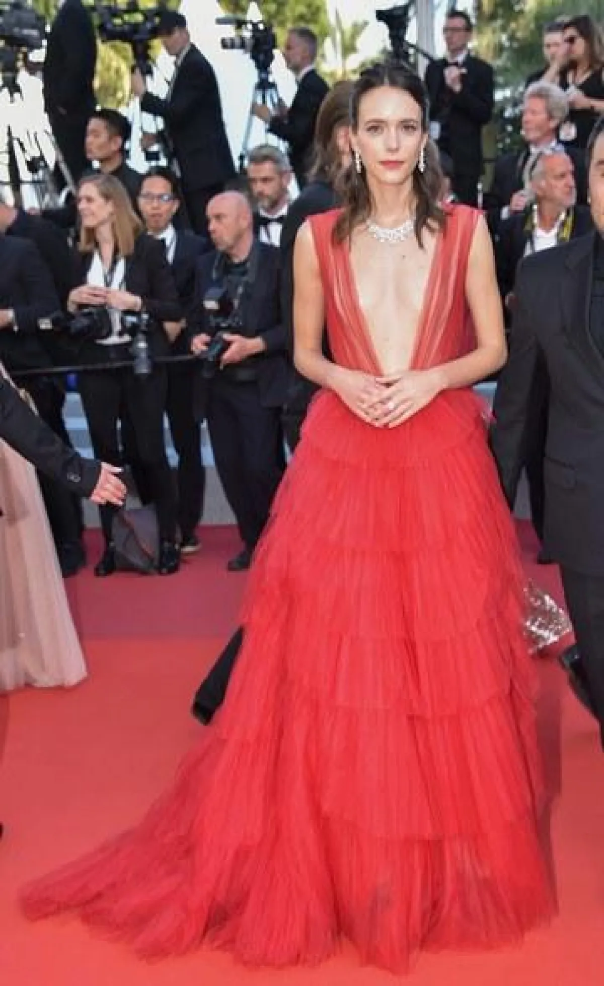 اختيار الأحمر على السجادة الحمراء من الخيارات الجريئة، ومعه ستبقَيْن إما متألقة جدًّا أو العكس، ولكنّ الممثلة الجميلة ستايس مارتن Stacy Martin بدت براقة، مع هذا الفستان المتدرج من الدانتيل المنفوش من دار الأزياء الفرنسية ديور Dior، الذي منحها طولًا مضاعفًا، نسقت معه مجوهرات ماسية لامعة باللون الأبيض، مع شعرها القصير وأحمر الشفاه الفاقع، ما لم يعجبنا فقط هو اختيار الفتحة الكبيرة من ناحية الصدر.