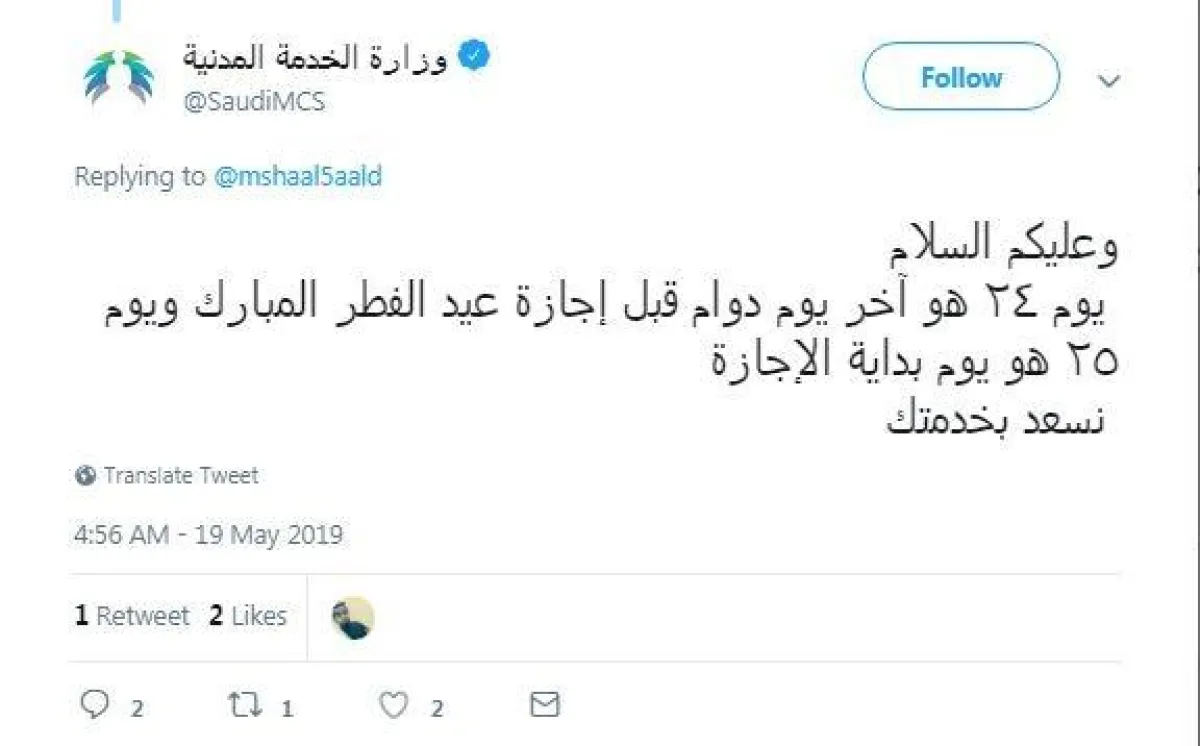 وكانت وزارة الخدمة المدنية قد تلقت استفساراً عبر حسابها على موقع "تويتر" من أحد الموظفين جاء فيه، هل إجازة العيد تبدأ بانتهاء دوام 25 الموافق يوم الخميس؟ أم تبدأ بانتهاء دوام 24 الموافق يوم الأربعاء؟.
