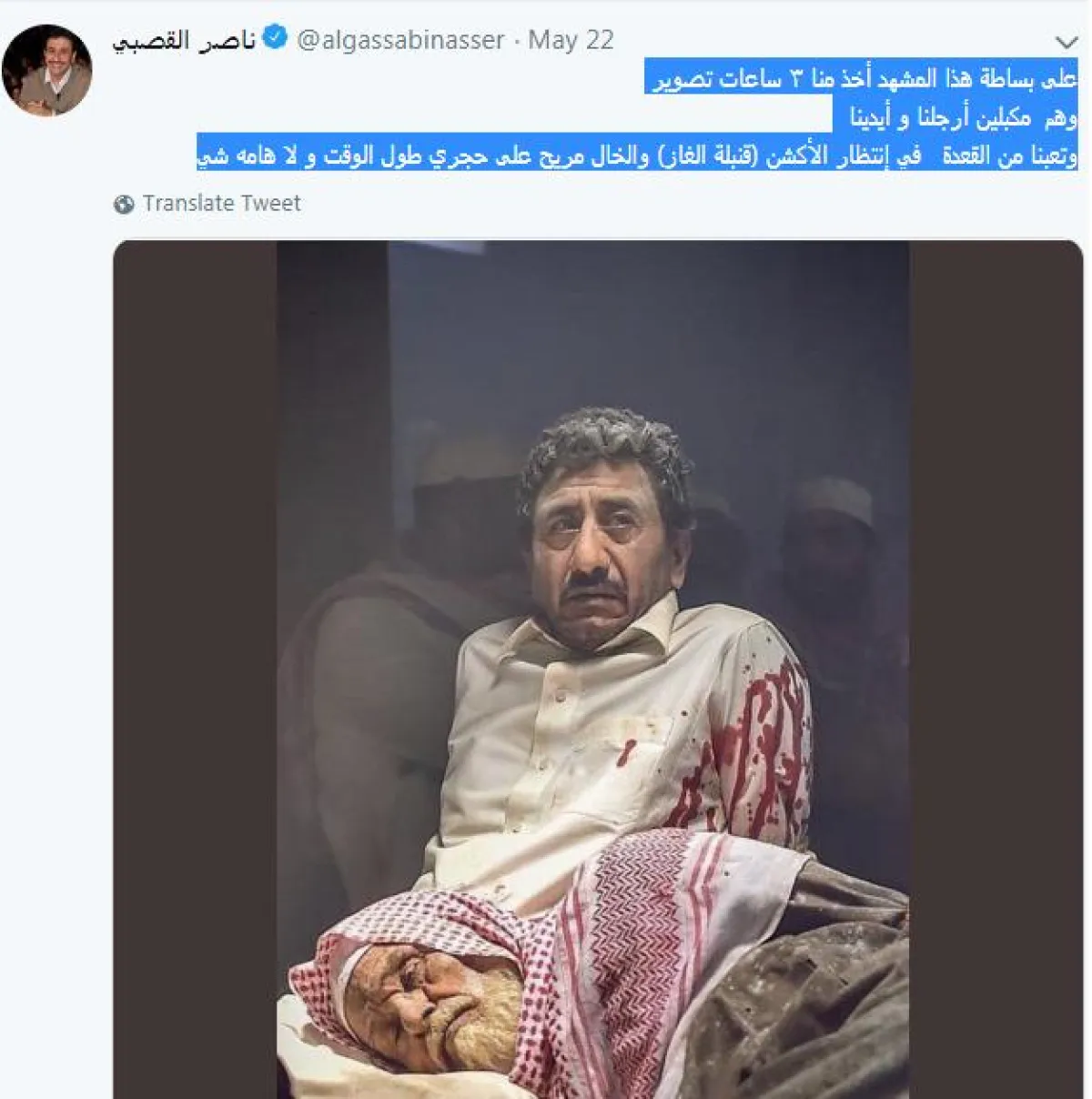 وعلق ناصر القصبي على المشهد عبر تغريدة له في حسابه على موقع التواصل تويتر: على بساطة هذا المشهد أخذ منا ٣ ساعات تصوير وهم مكبلين أرجلنا و أيدينا وتعبنا من القعدة في إنتظار الأكشن (قنبلة الغاز) والخال مريح على حجري طول الوقت و لا هامه شي!