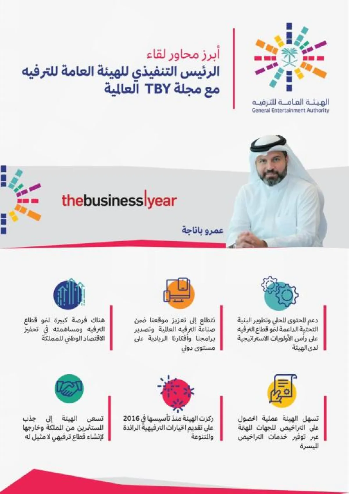 أكدّ الرئيس التنفيذي للهيئة العامة للترفيه الأستاذ عمرو بن أحمد باناجه أن الهيئة تهدف إلى جعل المملكة مرجعاً دولياً في مجال الترفيه من خلال تبني أفكاراً ريادية طموحة والعمل على تطويرها، وفق صياغة جديدة لمفهوم الترفيه بالمملكة بما يمهد لتصديرها عالمياً. مضيفاً في مقابلة أجراها مع مجلة TBY العالمية أن الهيئة تعمل وفقاً لمستهدفات رؤية 2030 على تطوير المحتوى المحلي لصناعة ترفيه يواكب المعايير العالمية وينسجم مع هوية الهيئة واستراتيجيتها الجديدة التي أطلقها رئيس مجلس الإدارة الأستاذ تركي بن عبدالمحسن آل الشيخ مطلع العام الجاري.