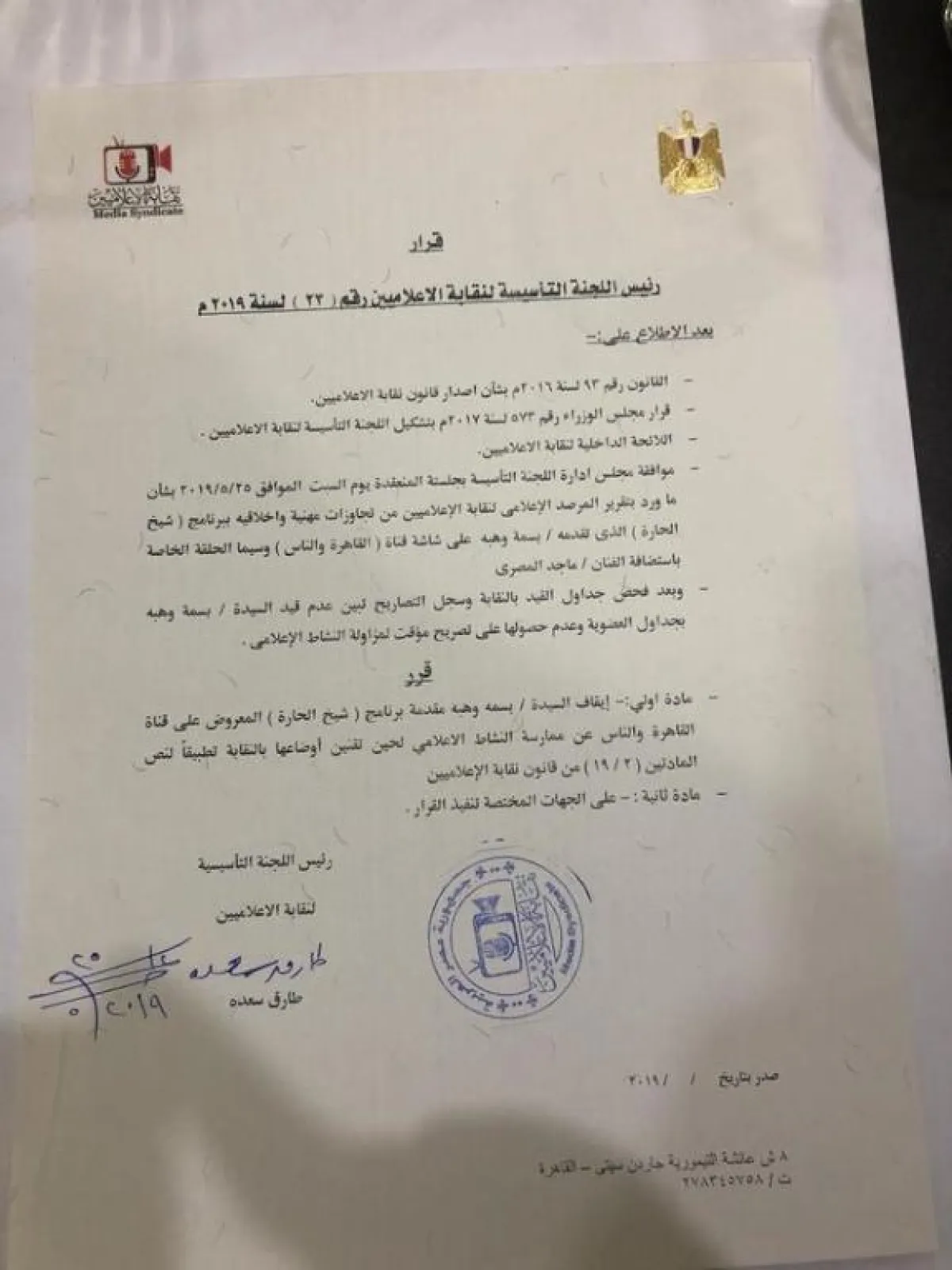 وأضاف سعدة: خالفت أيضا قانون نقابة الإعلاميين رقم 93 لسنة 2016 الذي حظر ممارسة النشاط الإعلامي دون القيد بجداول النقابة أو الحصول على تصريح مزاولة مهنة، حيث إنها لم تقم بتقنين أوضاعها مع النقابة، وغير مقيدة بأي من جداول القيد، ولم تحصل على تصريح مزاولة المهنة وفقاً للمادتين " 2 – 19 " من قانون النقابة.