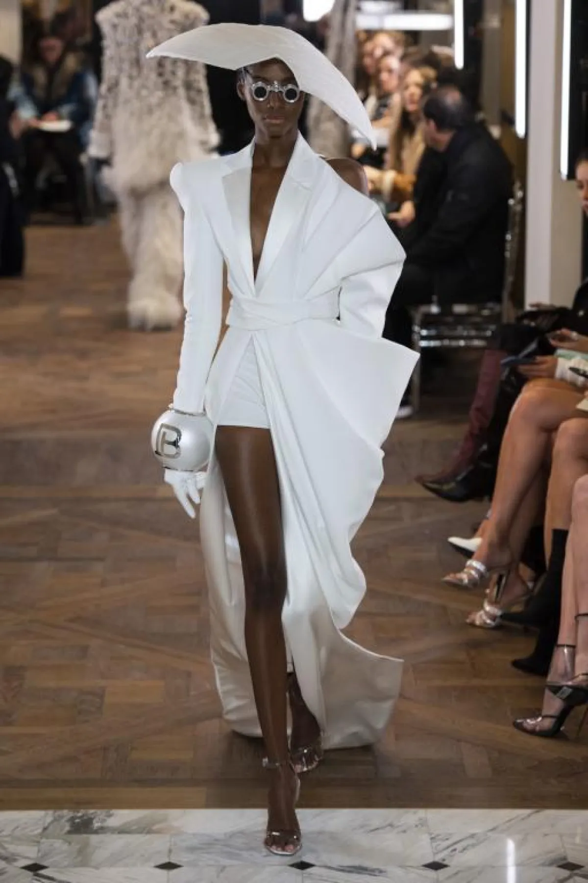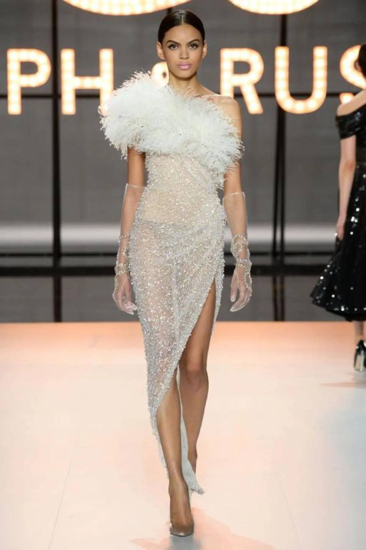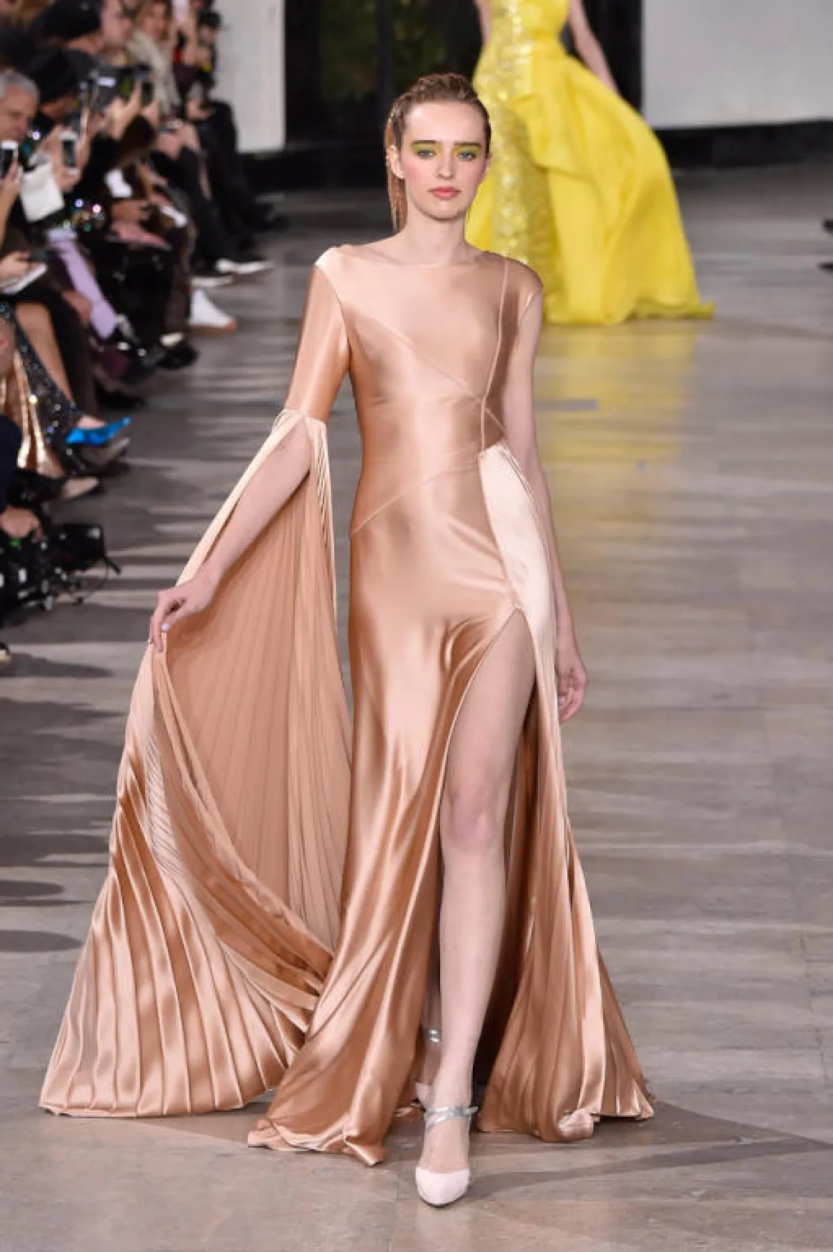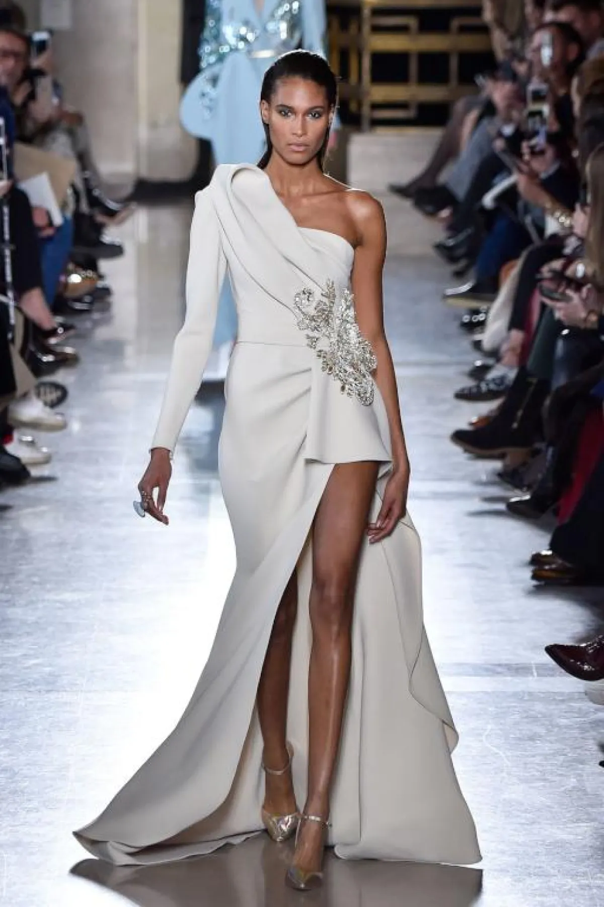 اعتمدي على الفساتين المنسدلة بشكل انسيابي، كالفستان من الأبيض من إيلي صعب Elie Saab مع الكشكشة عند فتحة الساق، واكسسوار فخم يزيّنها فوق الفتحة، مناسبة للمرأة الجريئة والواثقة من نفسها.