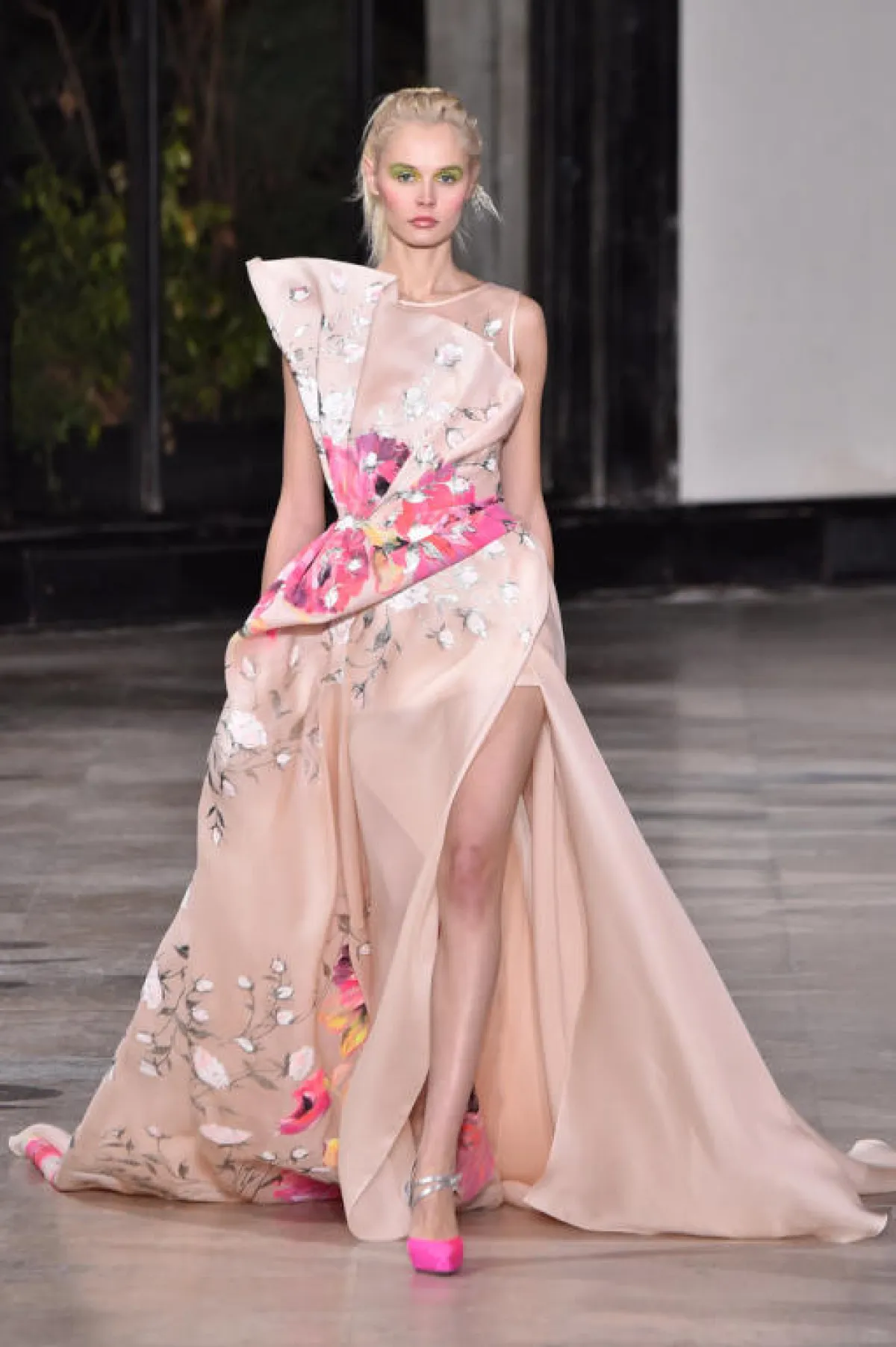 في المقابل يمكنكِ اعتماد الفساتين الربيعية المعرقة بالورود، كالفستان من جورج شقرا، بلمسة من درجات الفوشي الفاقع، المناسب للصبيّة التي تبحث عن اطلالة شبابية، ومناسبة لكِ أيضًا إن كنتِ بعمر صغير.