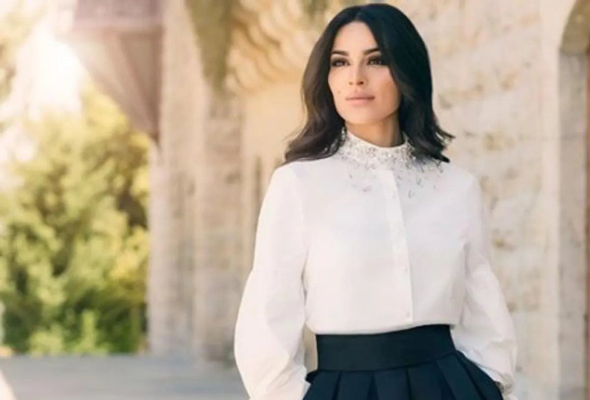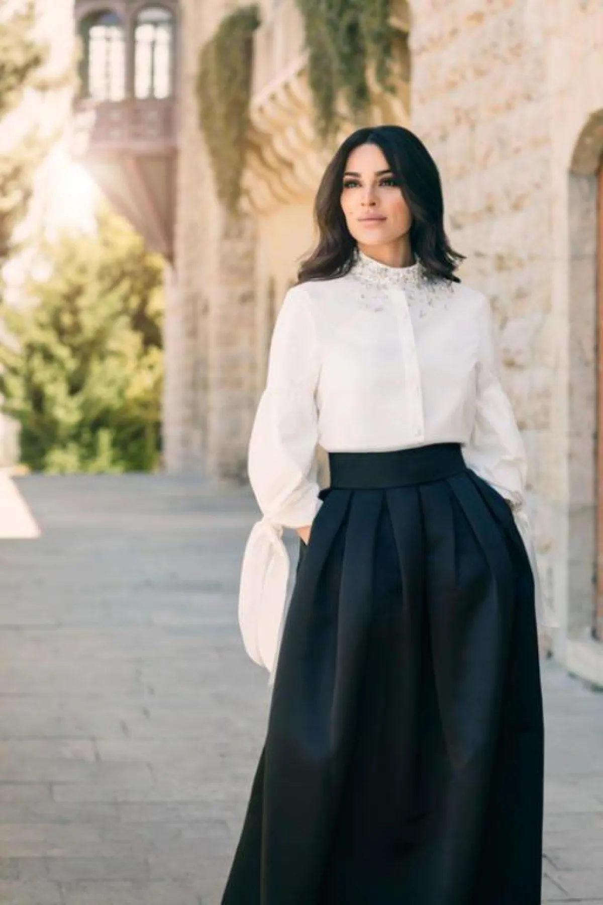 نادين نجيم في تنورة ماكسي مع قميص باللون الأبيض: