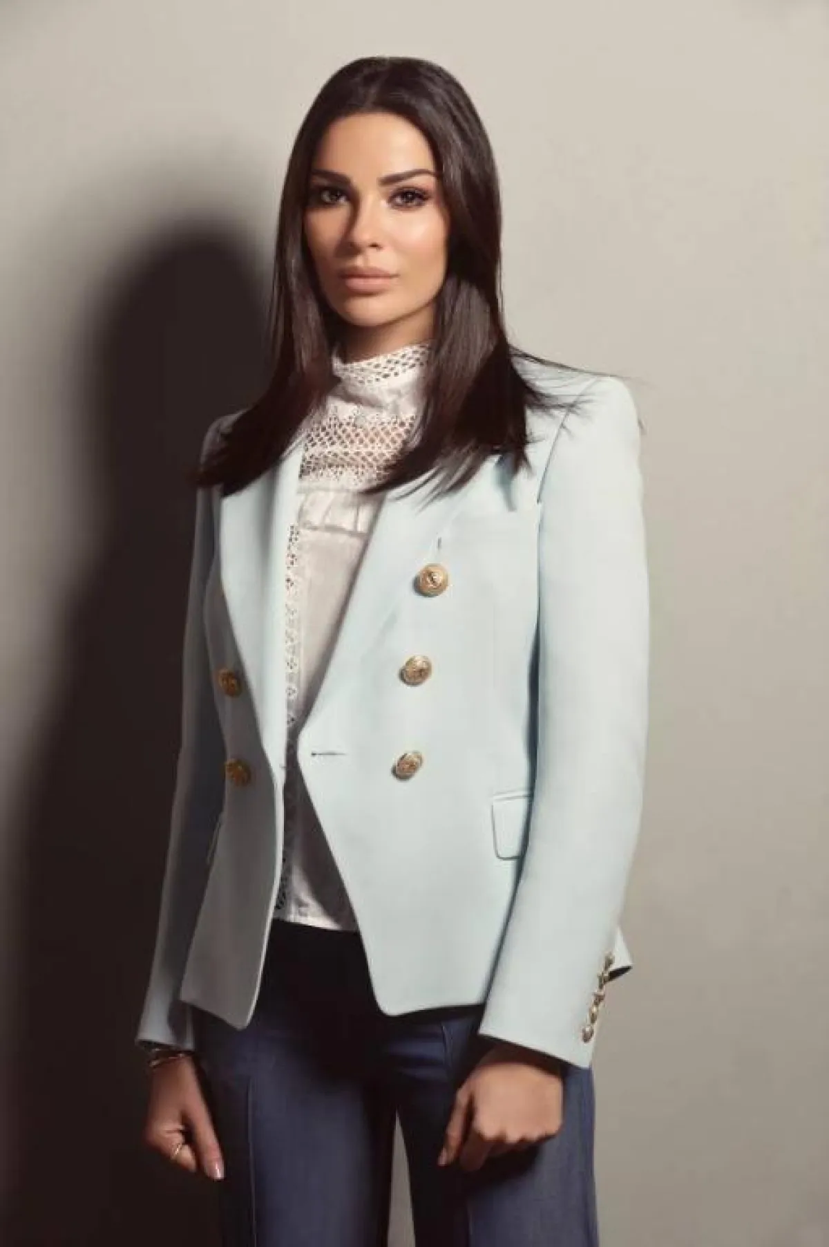تنسيق مميز آخر اعتمدته نادين نجيم مثالي للمرأة العاملة، اختارت فيه بنطلونًا قماشيًّا باللون الأزرق الداكن، وقد نسقت معه قميصًا ناعمًا باللون الأبيض من الدانتيل، وأكملت اللوك بجاكيت بليزر باللون الأزرق الفاتح من “بالمان” Balmain مزين بصفّي أزرار باللون الذهبي.