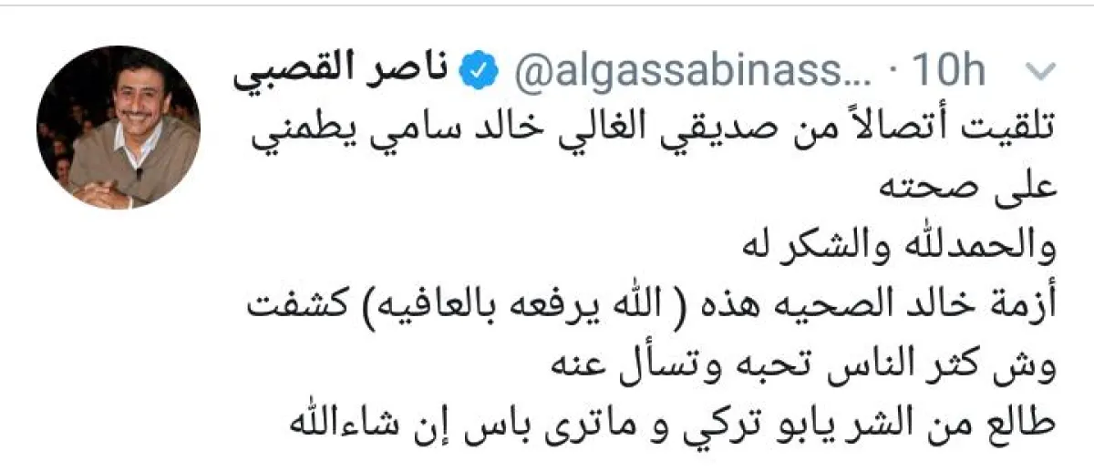 بعد الانتقادات الكثيرة التي تعرّض لها الفنان ناصر القصبي، بسبب تجاهله بالدعاء للفنان خالد سامي، كما فعل الكثير من الفنانين والإعلاميين، بعد تعرضه لأزمة صحية مفاجئة، بالرغم من العلاقة الفنية التي تجمع بينهما خصوصًا وأن مشوارهما الفني بدأ معاً، نشر القصبي تغريدة أشار فيها إلى أنّ الأخير اتصل به وطمأنه إلى صحته، مشيرًا إلى أنّ أزمة خالد سامي الصحية أكدت محبة الناس له، متمنيًا له الشفاء والعافية.