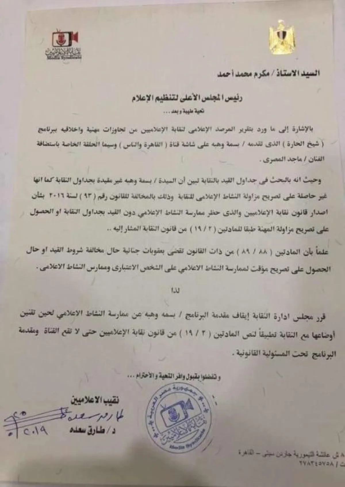 وصرح الدكتور طارق سعده نقيب الإعلاميين بأن النقابة حررت محضراً بقسم شرطة ٦ أكتوبر ثالث ضد قناة القاهرة والناس الفضائية لامتناعها عن استلام قرار النقابة الخاص بوقف بسمة وهبة مقدمة برنامج " شيخ الحارة " على شاشة القناة لمخالفة ميثاق الشرف الإعلامي وعدم تقنين أوضاعها مع النقابة طبقًا لنص المادتين " ٢ – ١٩ " من القانون ٩٣ لسنة ٢٠١٦ الذي يحظر ممارسة النشاط الإعلامي دون القيد في جداول النقابة أو الحصول على تصريح مزاولة مهنة.