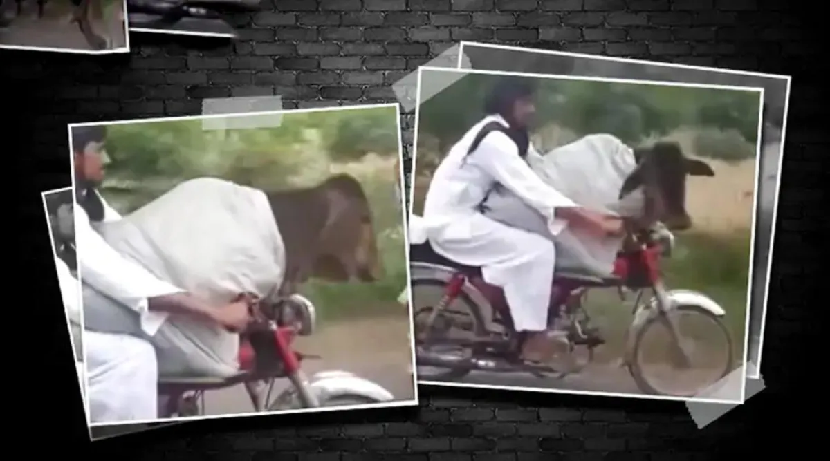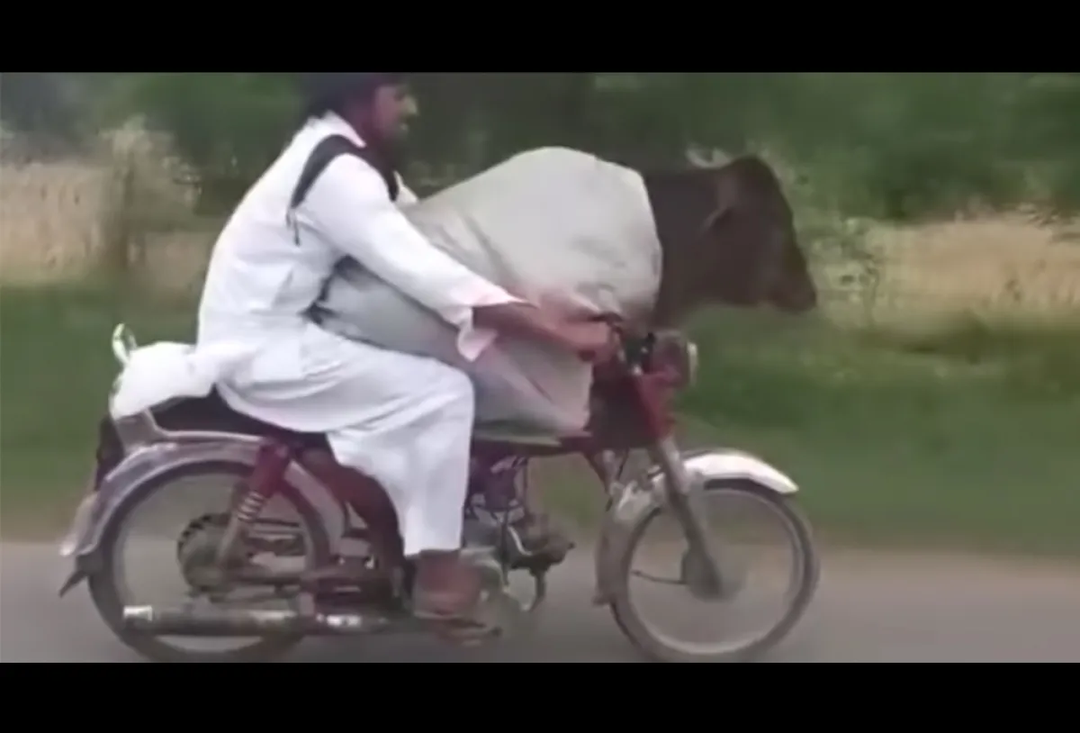 وبحسب موقع «إنديان اكسبريس»، فقد ظهر شريط فيديو على وسائل التواصل الاجتماعي يظهر رجلاً باكستانياً يركب دراجته النارية مع بقرته جالسة أمامه، حيث يركب الرجل بشكل مريح، بينما تجلس البقرة الضخمة أمامه المغطاة بقطعة قماش رمادية اللون وتستمتع بالنزهة بهدوء، وتم تصوير الحدث بأكمله بالكاميرا من قبل صديق لراكب الدراجة النارية وتمت مشاركتها في وقت لاحق على وسائل الإعلام الاجتماعية.
