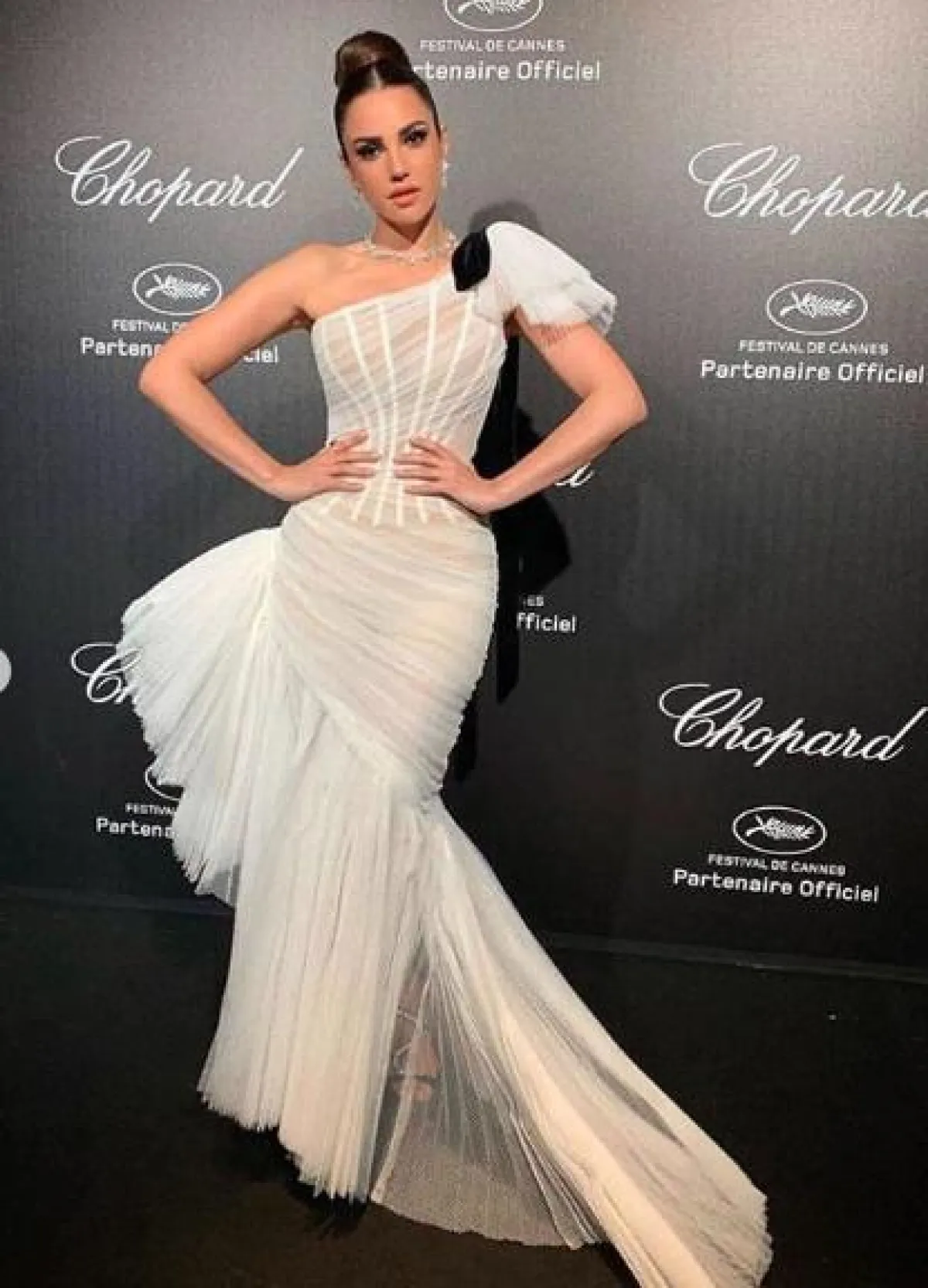 في حال كنتِ تبحثين عن اطلالة دراماتيكية لسهرات عيد الفطر، ننصحكِ أن تستوحي من اطلالة درة زروق في فستان من “جان لويس جبجي” Jean Louis Jabaji مصنوع من قماش التول باللون الأبيض، بقصة الكتف الواحد، ومزين بالكشكش من الجانب، به شريطة على الكتف باللون الأسود، تضفي عليه لمسات أنثوية ناعمة، وقد اختارت معه صندلًا بكعب عالٍ مزينًا بالكريستال، ومجوهرات ماسية فاخرة من “شوبارد” Chopard.