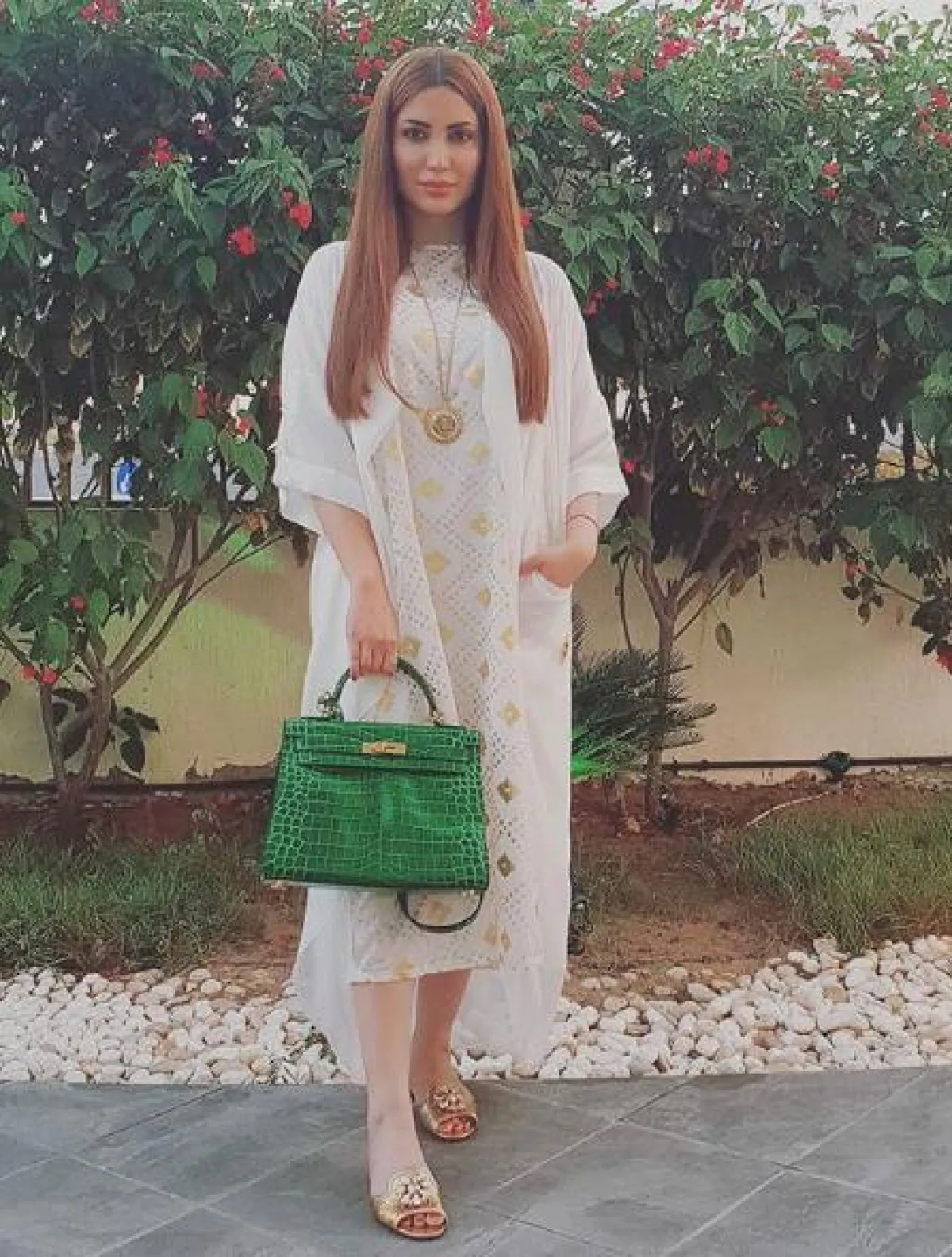 في اطلالة أخرى مميزة اعتمدتها نسرين طافش في رمضان 2019، اختارت فستان ماكسي باللون الأبيض، مطرزًا بخيوط ذهبية، وقد نسقت معه جلابية باللون الأبيض أيضًا، وأكملت اللوك بشنطة يد باللون الأخضر من “هرمس” Hermes، وصندل من دون كعب باللون الذهبي.