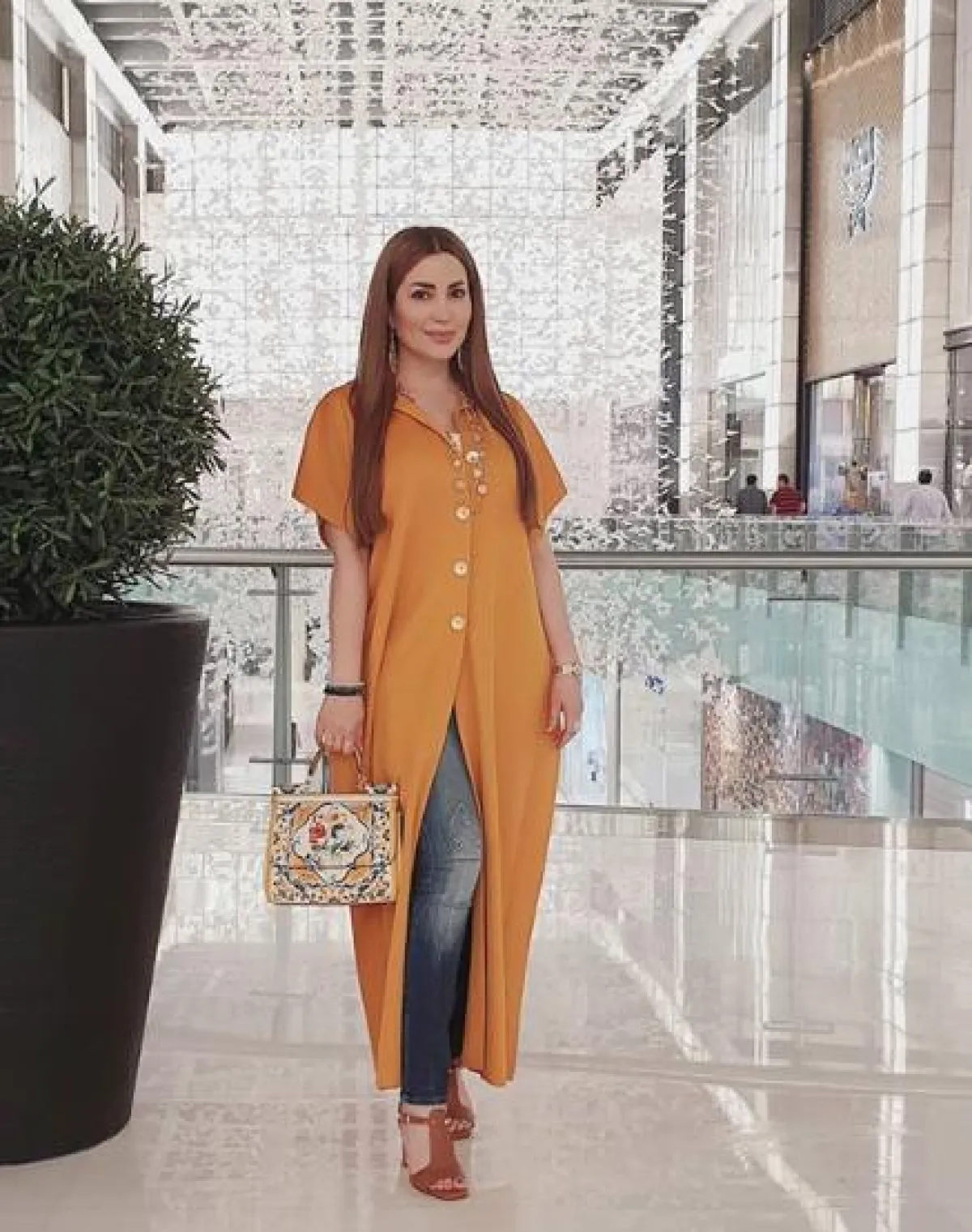 في بداية شهر رمضان، شاهدنا نسرين طافش في لوك كاجوال، جمع بين الأسلوب العصري مع لمسات شرقية مميزة، حيث اختارت قميصًا طويلًا يشبه الجلابية، باللون البرتقالي الهادئ، ونسقت معه بنطلون جينز، وصندلًا بكعب عالٍ باللون البني، وشنطة يد ملونة ومزخرفة من “دولتشي أند غابانا” Dolce&Gabbana.