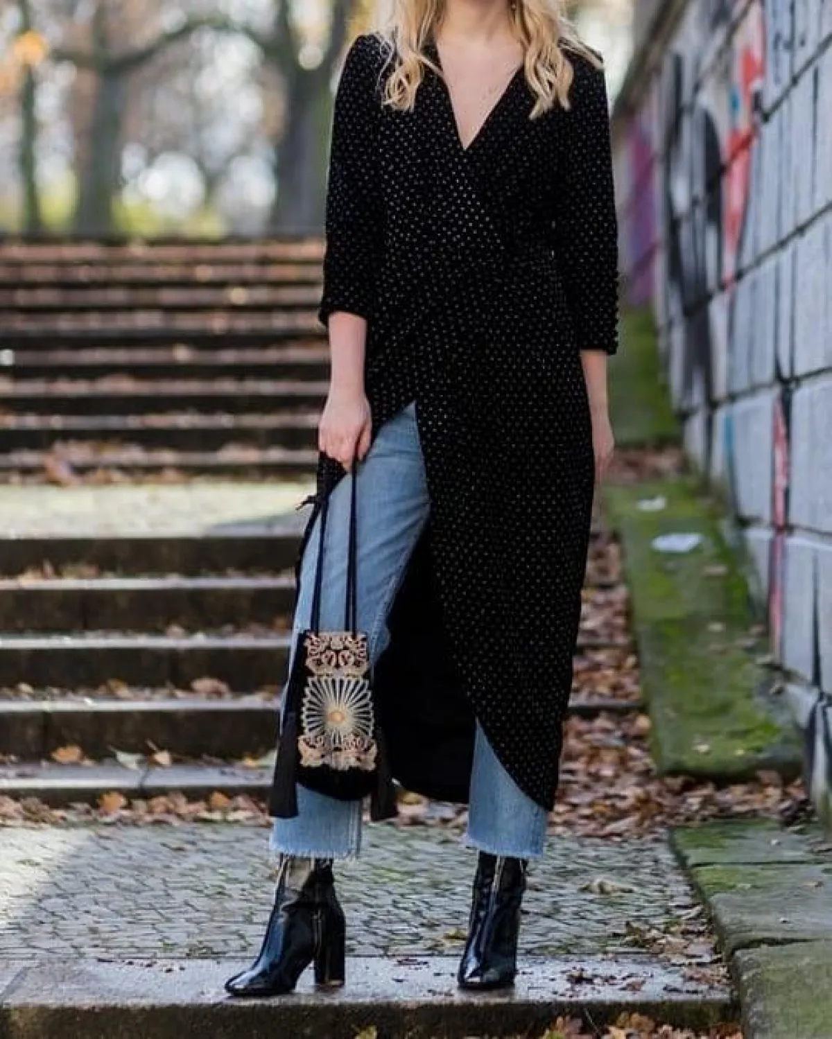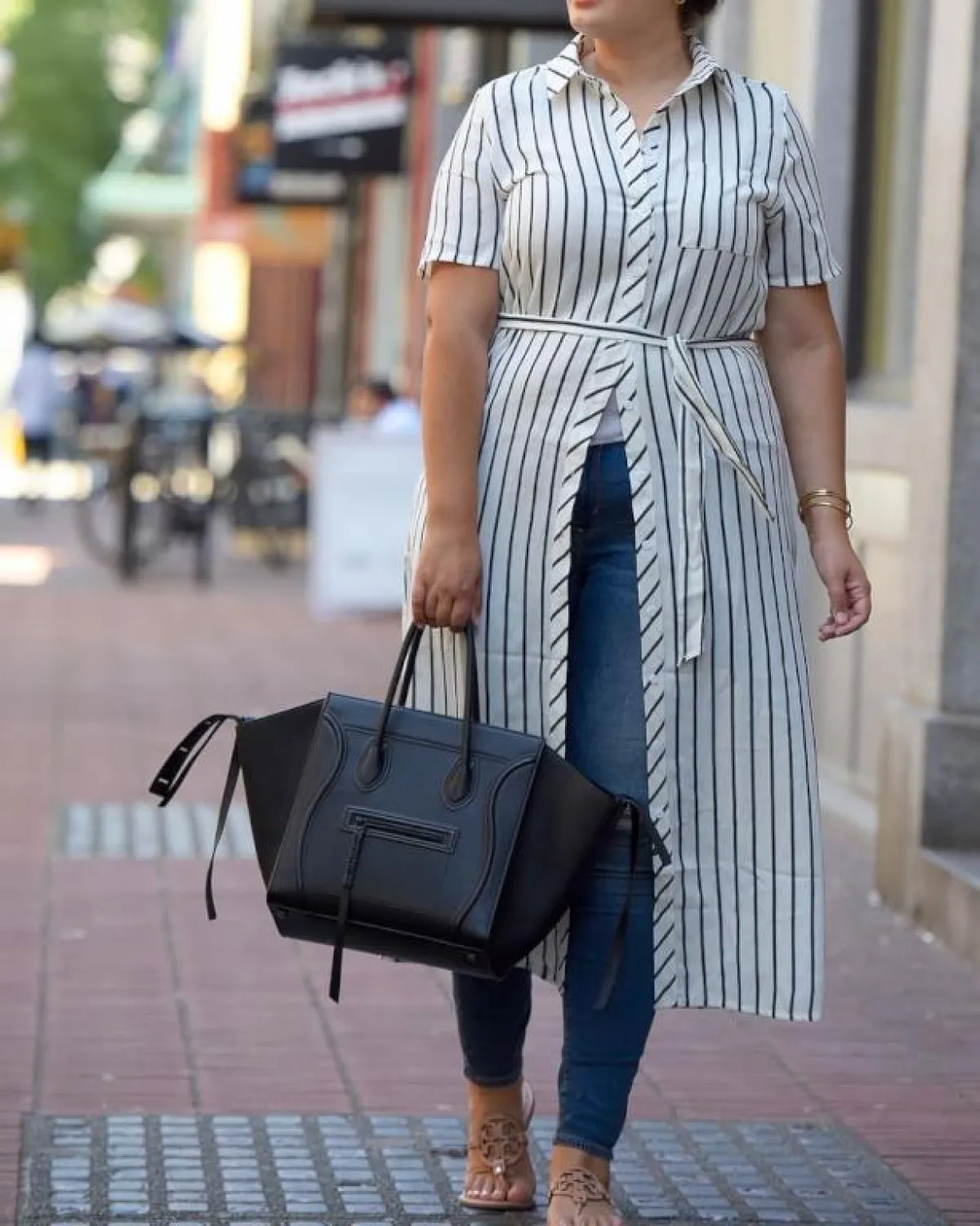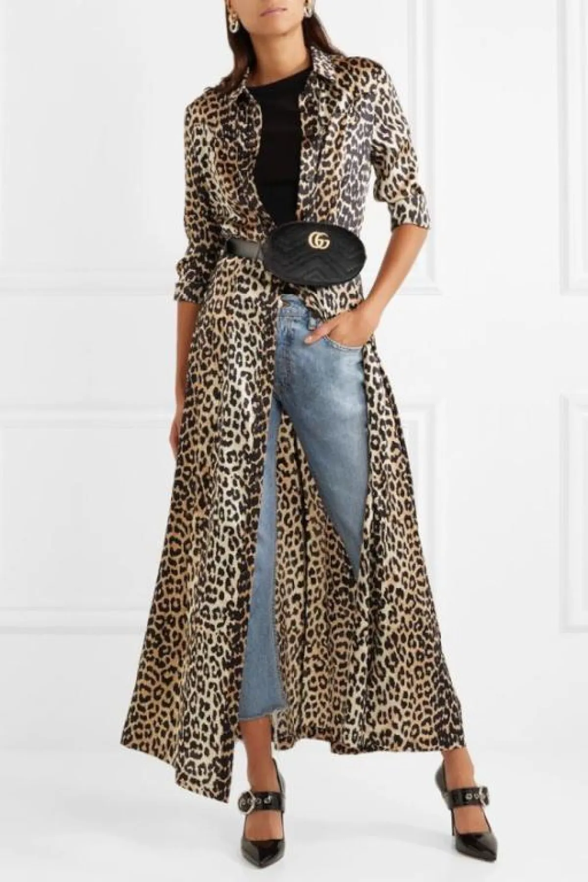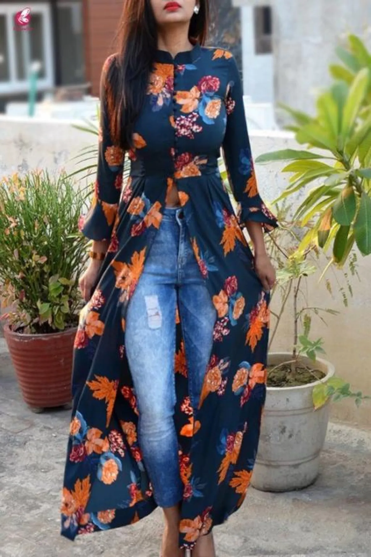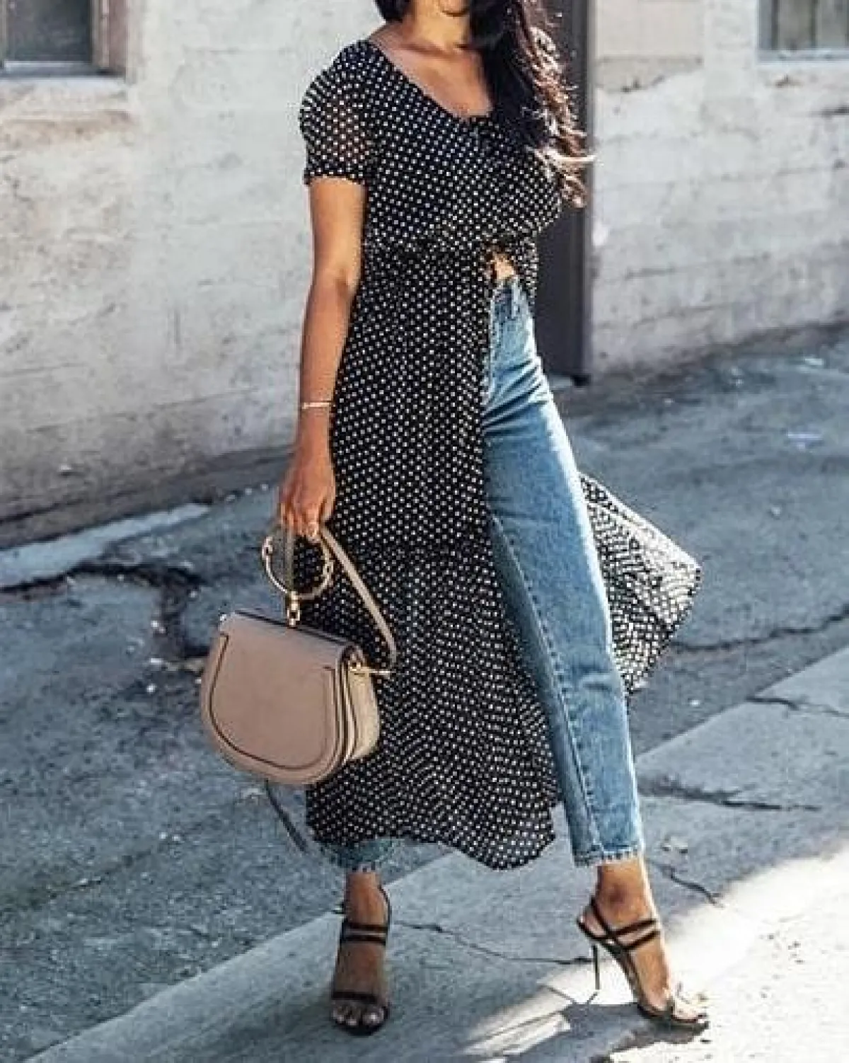 اعتمدت بثينة الرئيسي فستانًا موردًا بتصميم يلف الخصر، يتميز من الأمام بأزرار تمتد لنهاية الفستان بشق أمامي، ونسقت معه جينز سكيني، وحزام جلد عريضًا.