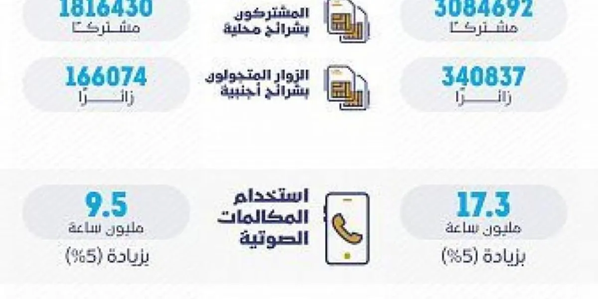 وأبانت، أنه تم إجراء 17.3 مليون ساعة مكالمة في مكة المكرمة و9.5 مليون ساعة مكالمة في المدنية المنورة، وذلك بزيادة 5% مقارنة بالفترة نفسها العام الماضي، وبمؤشر نجاح للمكالمات تجاوز 99 %.