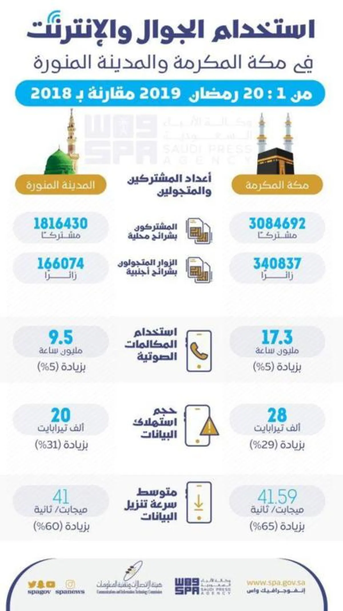 وأوضحت، أن إحصائيتها الخاصة لأداء شبكات الاتصالات في مكة المكرمة والمدنية المنورة خلال الفترة من 1- 20 رمضان 1440، سجلت مستويات عالية تجاوز فيها حجم استهلاك البيانات في مكة المكرمة 28 ألف تيرابايت، بزيادة 29% مقارنة بالفترة نفسها العام الماضي، بينما بلغ متوسط سرعة تنزيل البيانات 41.59 ميجابت / ثانية، بزيادة 65% عن العام الماضي، وفي المدينة المنورة تجاوز استخدام البيانات 20 ألف تيرابايت، بزيادة 31% مقارنة بالفترة نفسها العام الماضي، وبلغ متوسط سرعة تنزيل البيانات 41 ميجابت/ ثانية، بزيادة 60% عن العام الماضي.