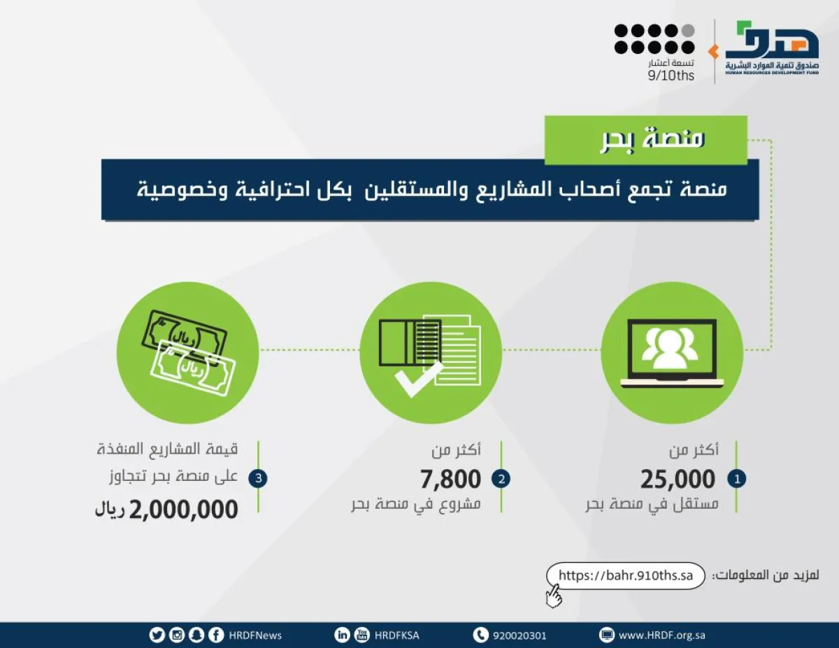كشف صندوق تنمية الموارد البشرية (هدف)، عن تسجيل 7800 مشروع في منصة العمل الحر (بحر)، كما شهدت المنصة تسجيل أكثر من 25 ألف شخص مستقل، وتجاوزت قيمة المشاريع المنفذة على المنصة مليوني ريال.