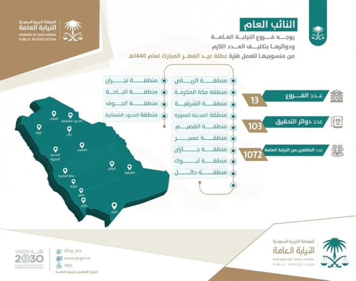 وبحسب الإنفوجراف فقد بلغ عدد الموظفين المكلفين بالعمل خلال عطلة عيد الفطر المبارك أكثر من 1000 موظف في 13 فرعاً و103 دوائر تحقيق.