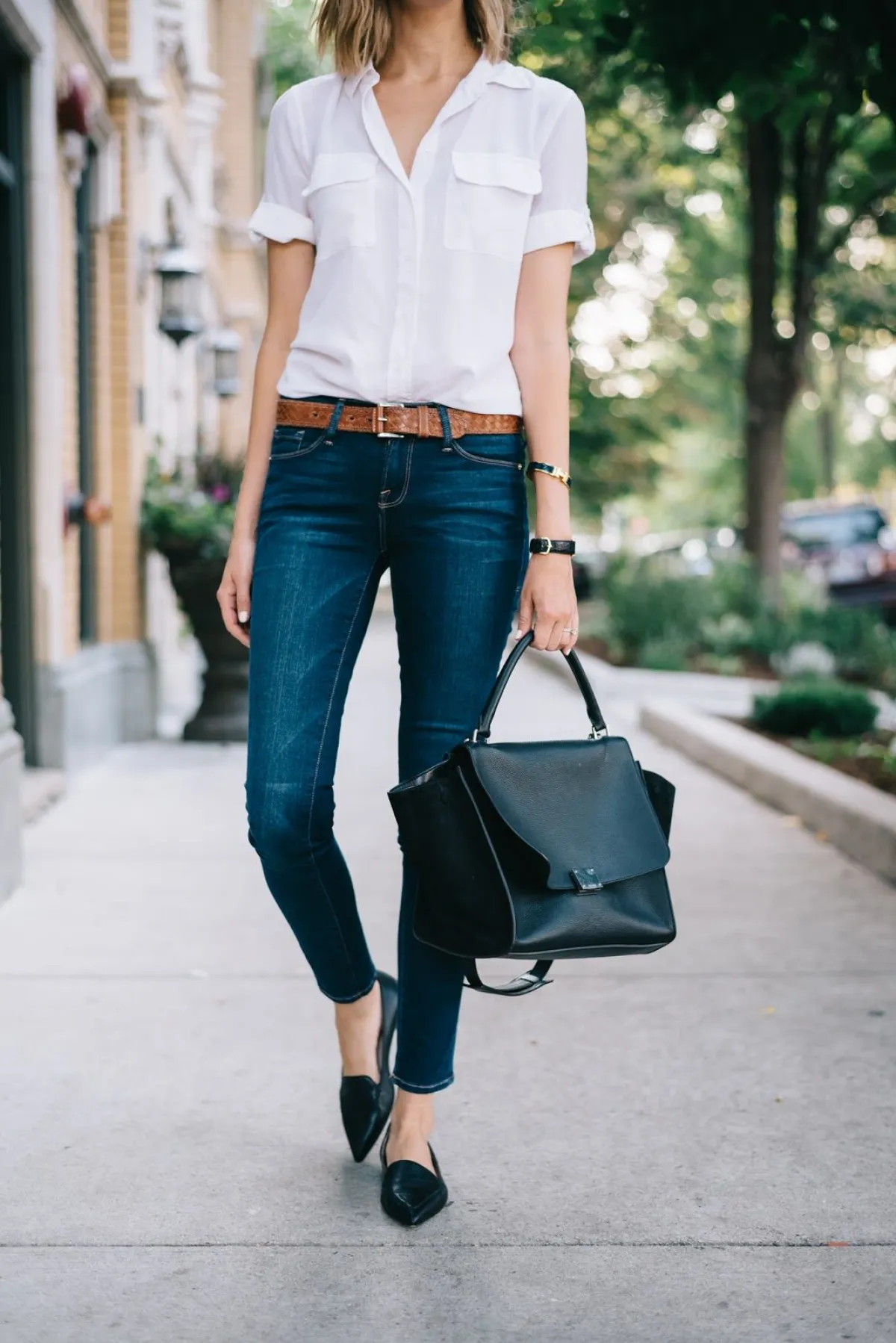 نسّقي السكيني جينز مع قميص أو توب بألوان رسمية كالأسود أو الأبيض، وأضيفي لاطلالتك حذاءً بكعب مربّع أو حذاءً مسطّحاً بمقدمة مدبّبة .