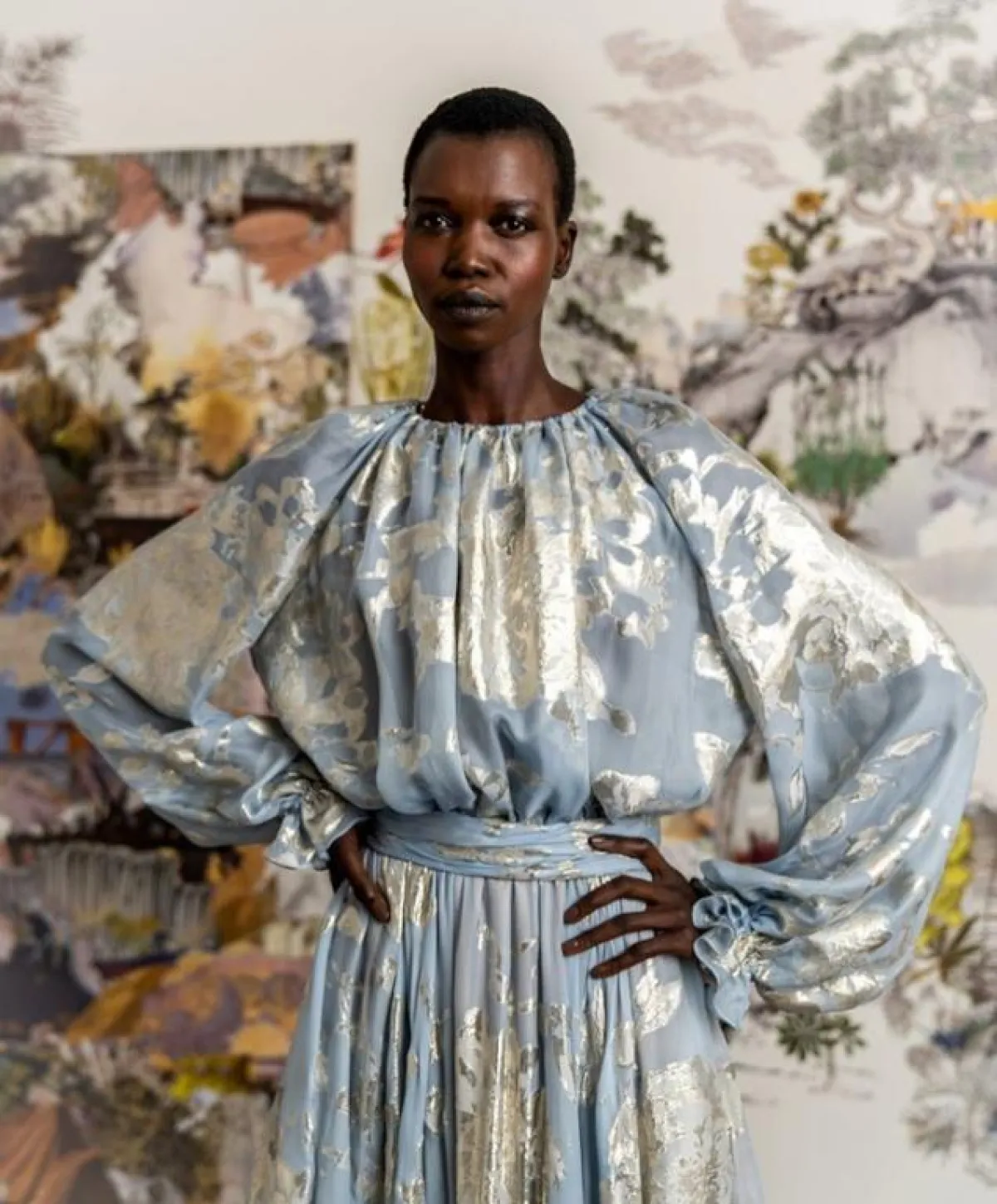 يمكنكِ اختيار التصميم الشيفون بألوان البيبي بلو مع الورود اللامعة، وحزام الخصر، والكشكشة على الأكمام، نسقي معها حجابًا أبيض، وصندلًا بكعب عالٍ باللون البيبي البلو.