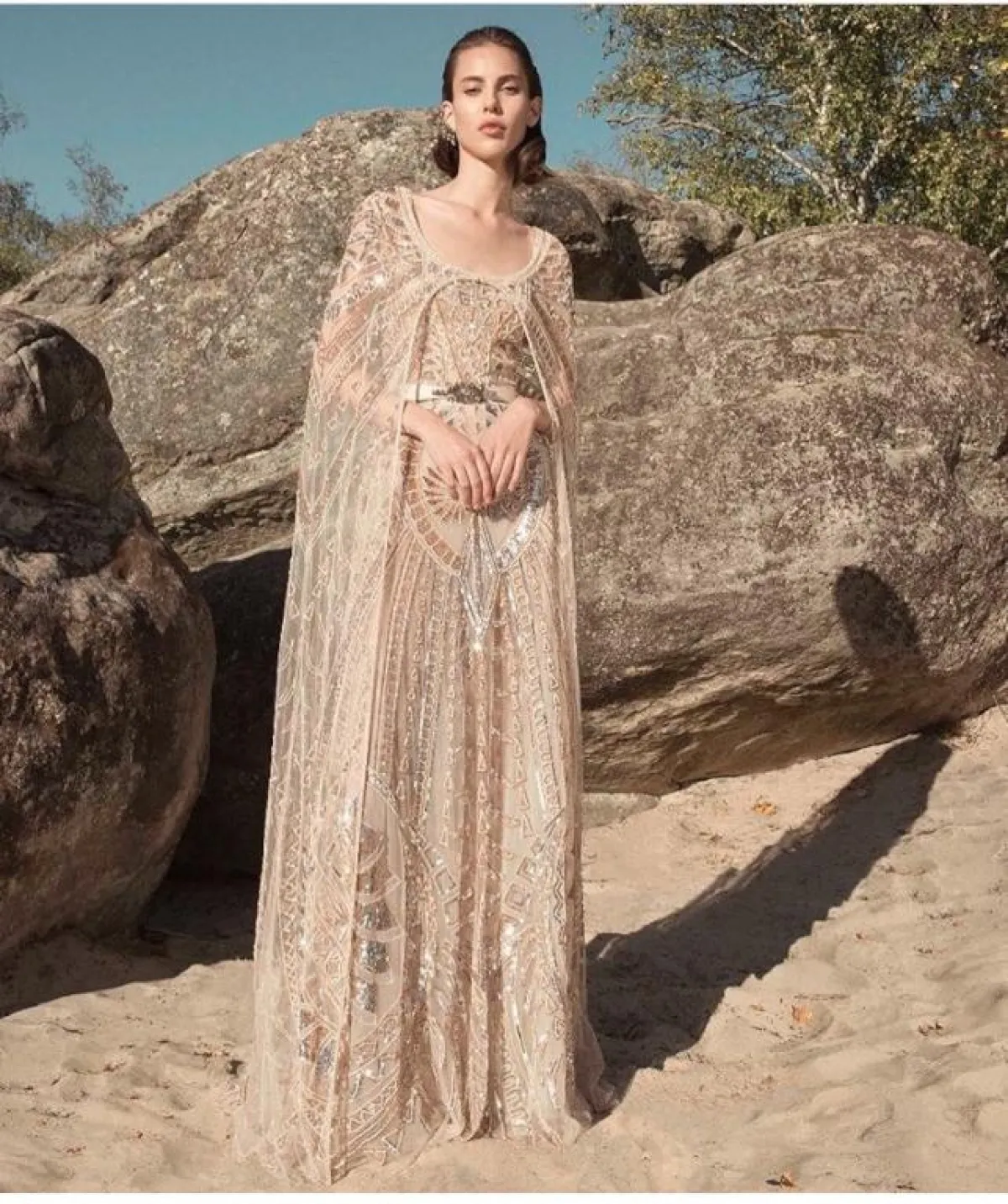 لفتنا صيحة الكاب التي تزين فساتين زهير مراد Zuheir Morad ، كهذا الفستان النود المطرز بالكامل، مع التول الشفاف، ستحتاجين معه لبطانة قوية، تناسب حجابكِ، مع التصميم الشفاف للفستان، مناسب أكثر لسهرات عيد الفطر، مع كلتش ذهبي وصندل نود.