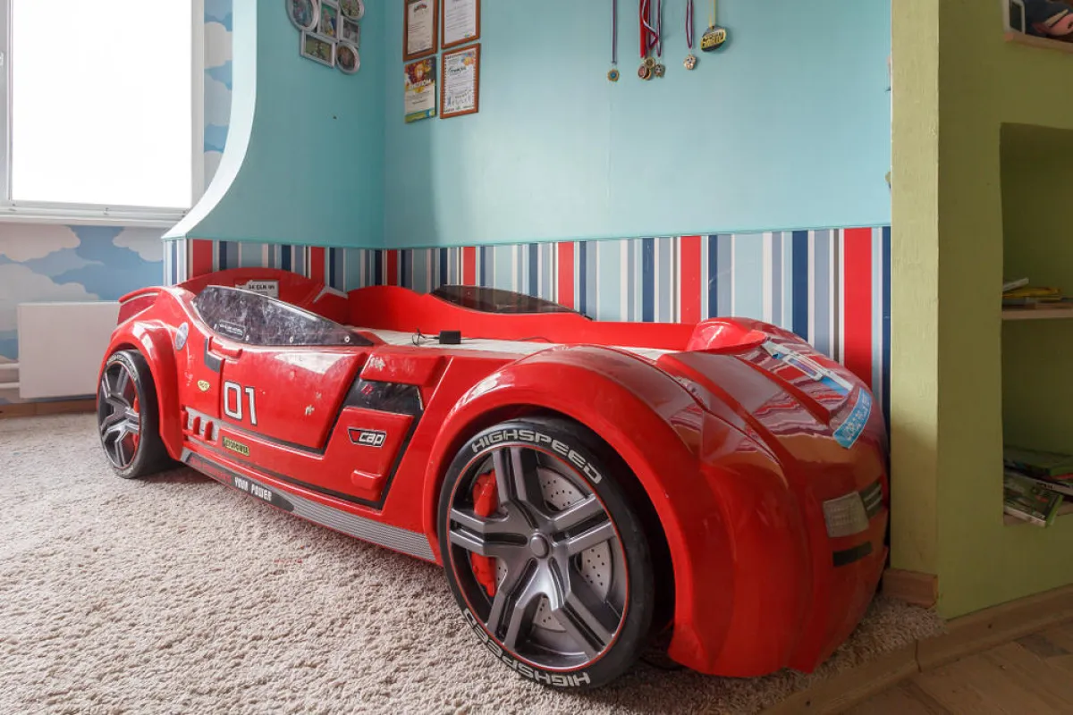 • تأتي الخزانة مُزوَّدة بثلاث درف أو أربع منها، إلَّا أنَّ الألوان تلعب دورًا بارزًا في هذا الإطار. مثلًا: يُختار طلاء أحمر لغطاء الخزانة، مع تصميم الدرف وفق أشكال كرتونيَّة معتمدة في الغرفة. ويُمكن أن تكون الأخيرة رسمة أو عبارة عن أشكال نافرة ثلاثيَّة الأبعاد، أو اعتماد لون من ألوان غرفة النوم. مثلًا: عند اعتماد سيارة الـ"فيراري"، يُمكن أن تكون الخزانة حمراء بالكامل، فتُنقش عليها كلمة "فيراري".