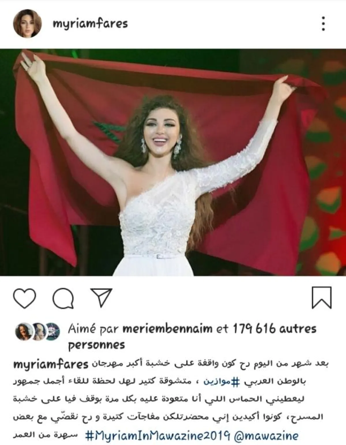 وشاركت ميريام ، على حسابها الرسمي على تطبيق الصور والفيديوهات "انستغرام"، صورة لها وهي رافعة للعلم الوطني في حفل أحيته ضمن فعاليات مهرجان موازين ، في إحدى دوراته السابقة.