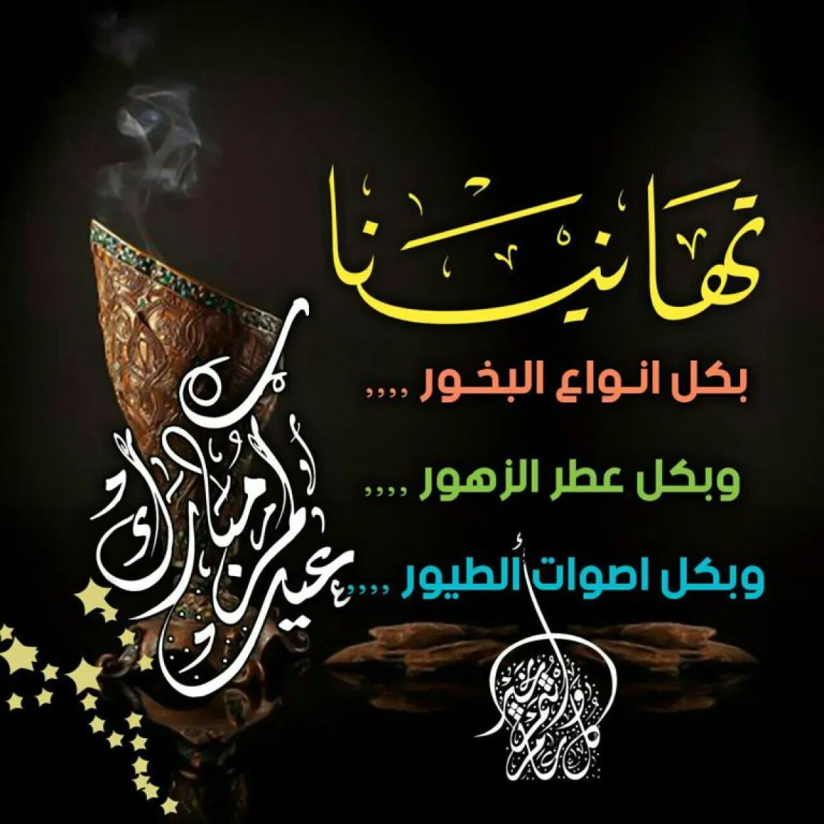 - بكل أنواع البخور.. وبكل عطر الزهور.. وبكل أصوات الطيور.. أقول لكم كل عام وأنتم بخير.