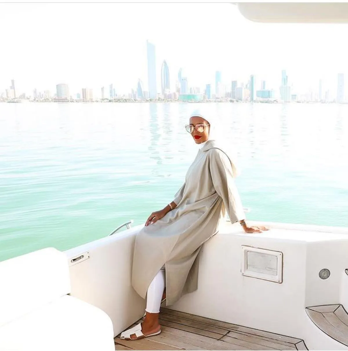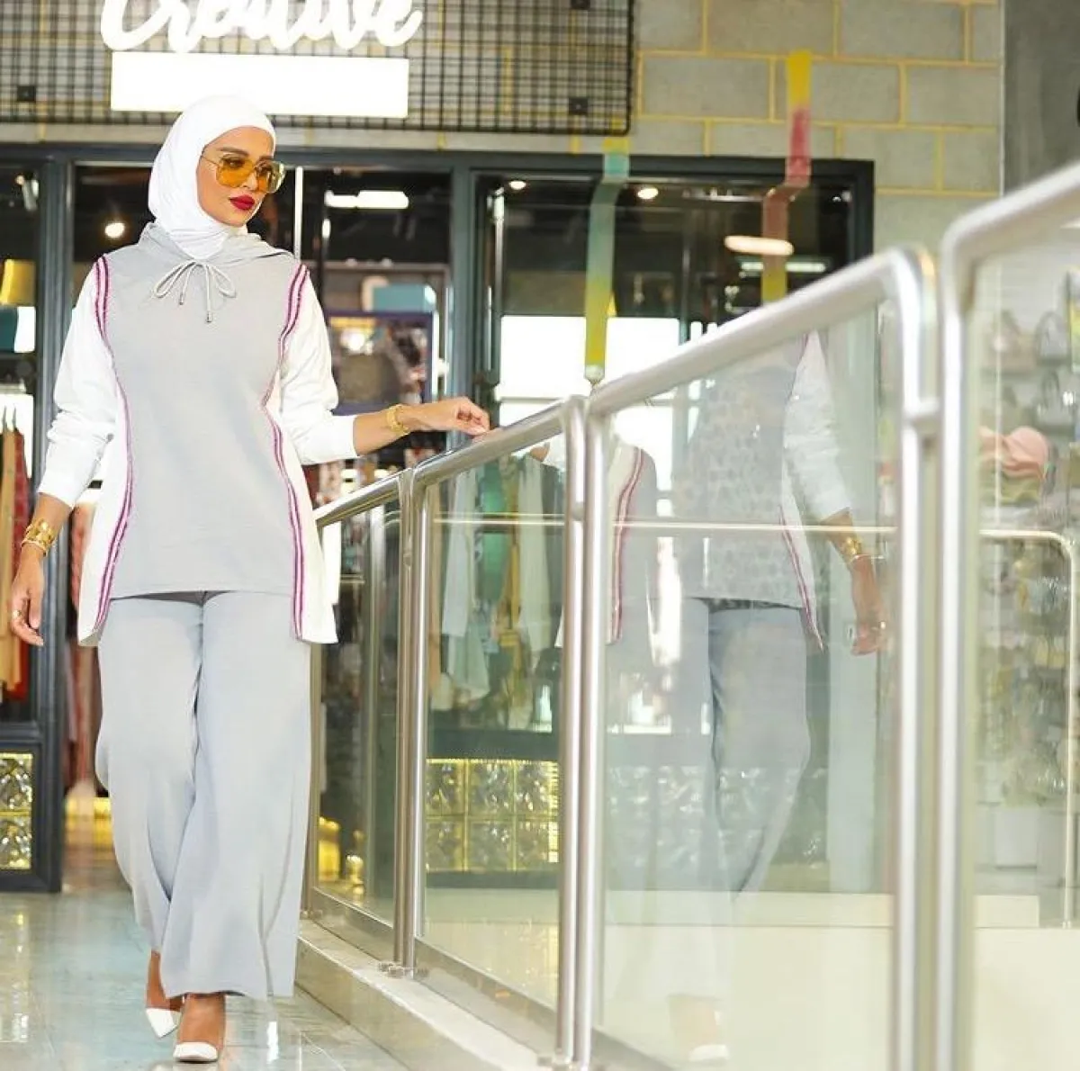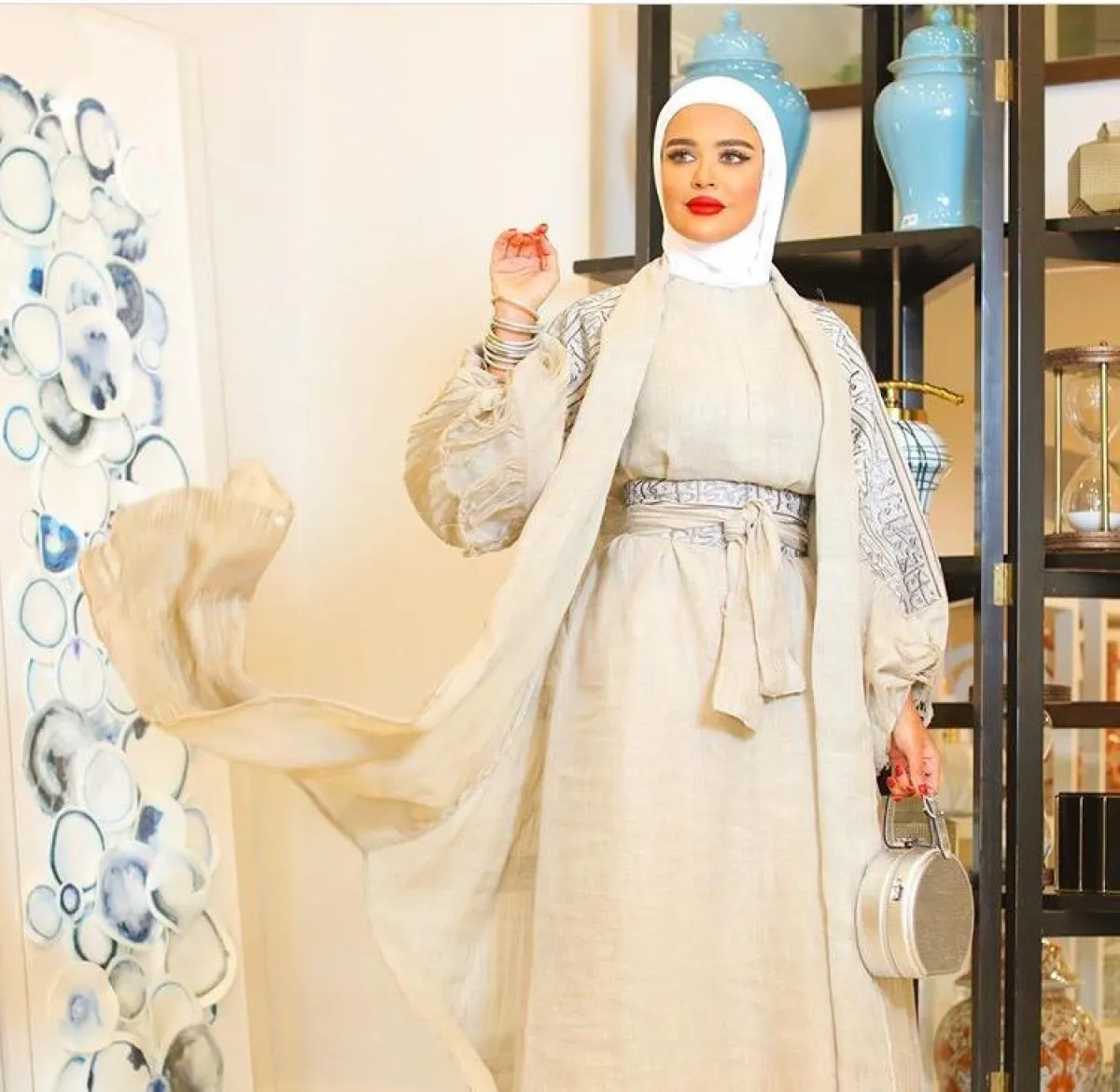 أما الفاشينيستا مرمر محمد فعندما تعتمد ألوان النود، فهي غالبًا لا تكسر حدة هذه الألوان، بل على العكس تركز أكثر على اللوك الحيادي، كاطلالتها بالعباية المفتوحة من خامة الكتان المنسدلة، مع رسومات درجات البيبي بلو، نسقت معها حجابًا أبيض وكلتش بالألوان نفسها.