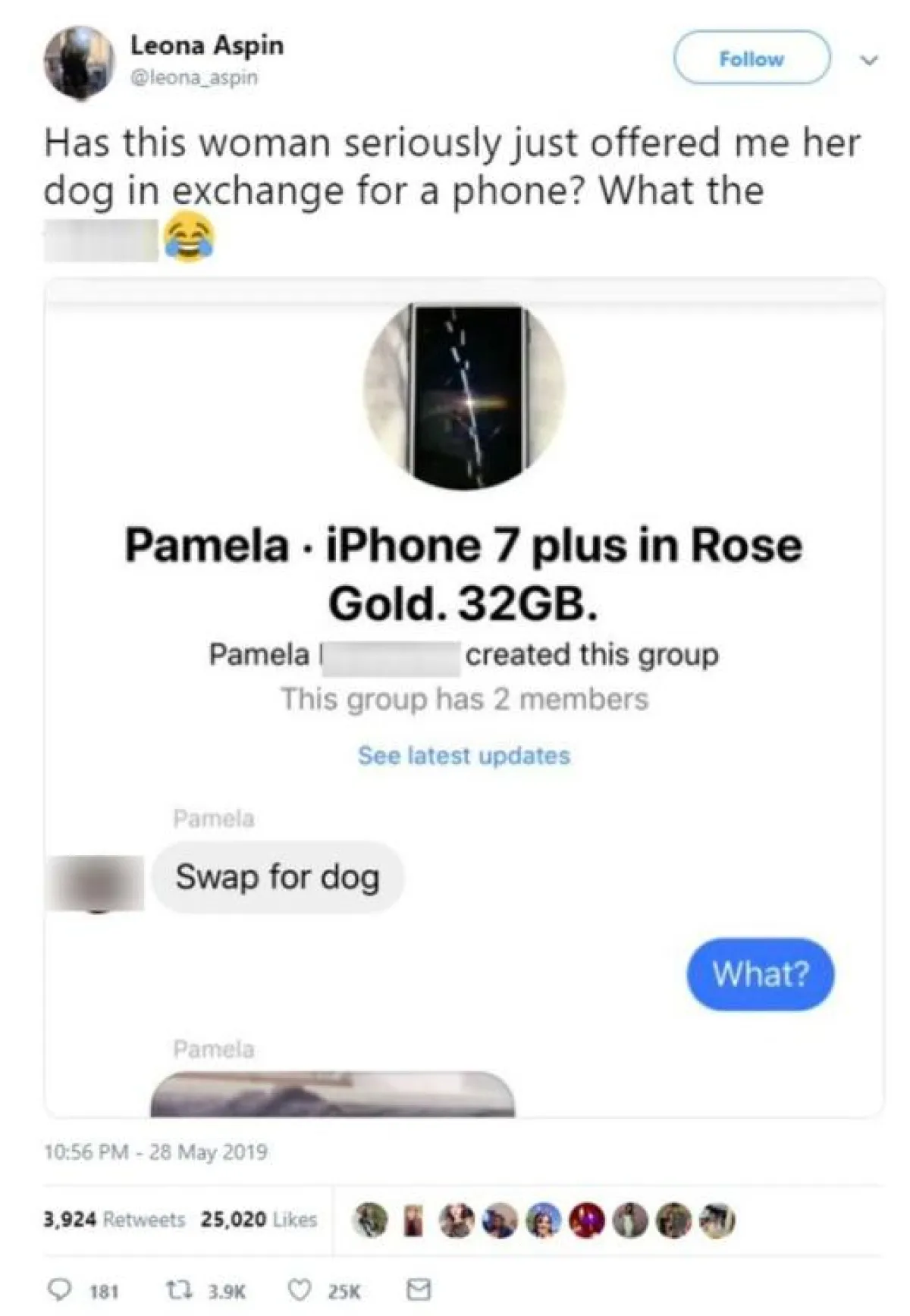 اندهشت «ليونا» من هذا العرض وهذا ما جعلها تنشر صورة لصفحة محادثتها مع «باميلا» على تويتر وكتبت: «هل تعرض هذه المرأة على محمل الجد كلبها في مقابل الهاتف؟»، وفور نشر المحادثة، دُهش مستخدمو الويب واقترحوا على «ليونا» أن تأخذ الصفقة.