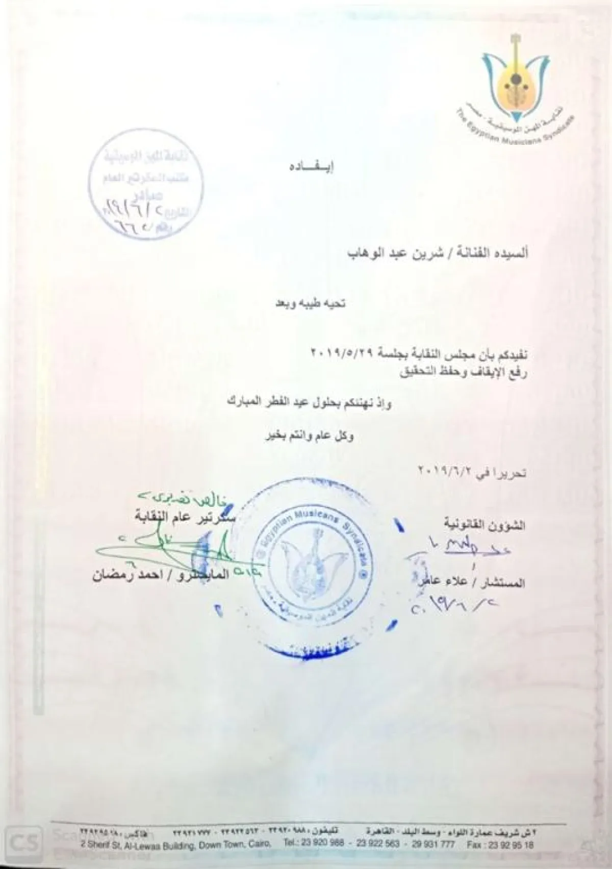 وقالت النقابة في التوضيح الرسمي: بشأن أزمة شيرين الأخيرة مع نقابة المهن الموسيقية، وإصدار قرار بوقفها عن العمل منذ أكثر من شهرين، على خلفية حفلها الأخير بدولة البحرين، فقد أصدرت النقابة بجلستها المنعقدة بتاريخ 29/5/2019 قرار بالاكتفاء بمدة الوقف الماضية، وإلغاء القرار من تاريخ الجلسة، بناءً على اعتذار مكتوب إلى النقابة، تعتذر للشعب المصري ونقابة المهن الموسيقية وعلى رأسها الفنان هاني شاكر، وأوضحت أيضًا أنها لم تكن تقصد أيّ معنًى يُفهم منه إساءة لبلدها مصر.