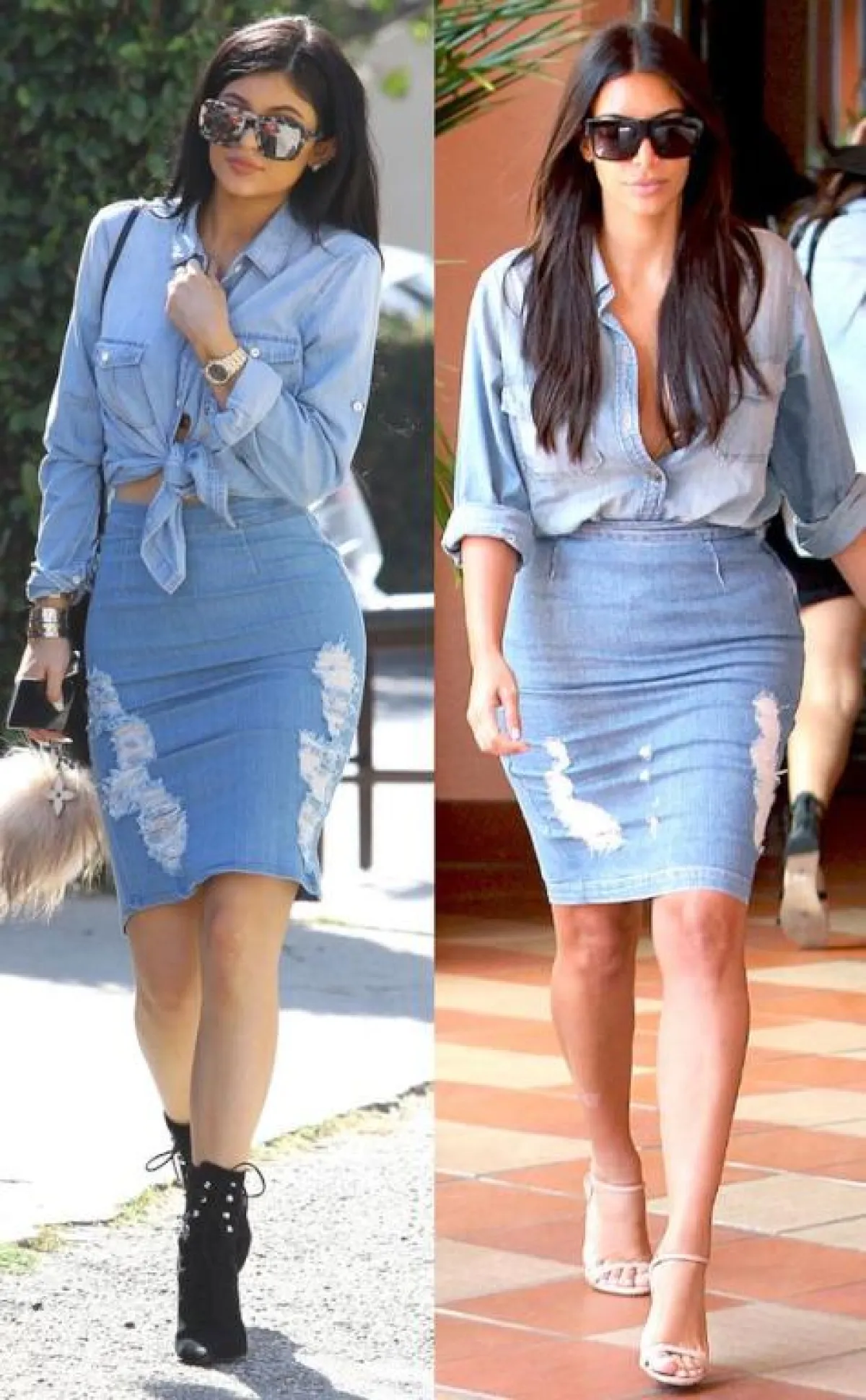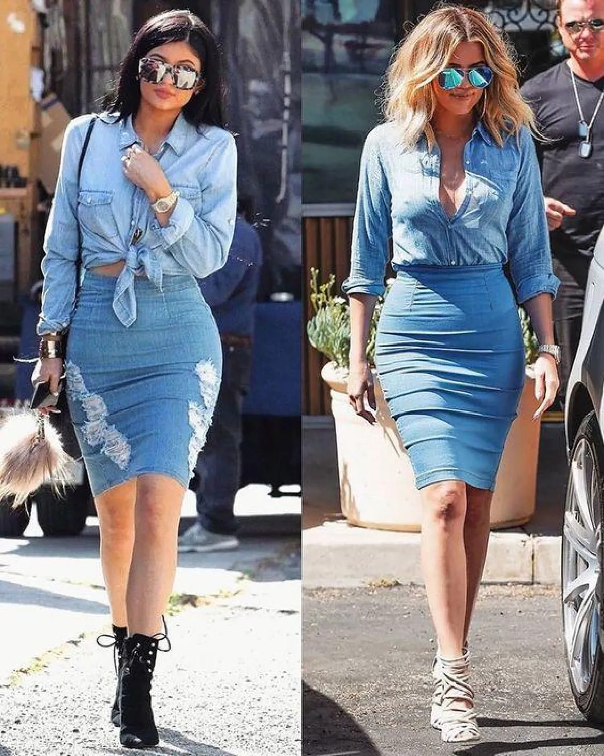 تعشق العديد من النساء تنسيق أزيائها من اللون نفسه، فإذا أرادت القيام بذلك مع الدنيم، فيمكنها تنسيق قميص جينز مع تنورة ميدي، وإضافة حذاء الكاحل أو صندل بكعب عالٍ، كالتي اعتمدتها كايلي جينر وكلوي كارداشيان .