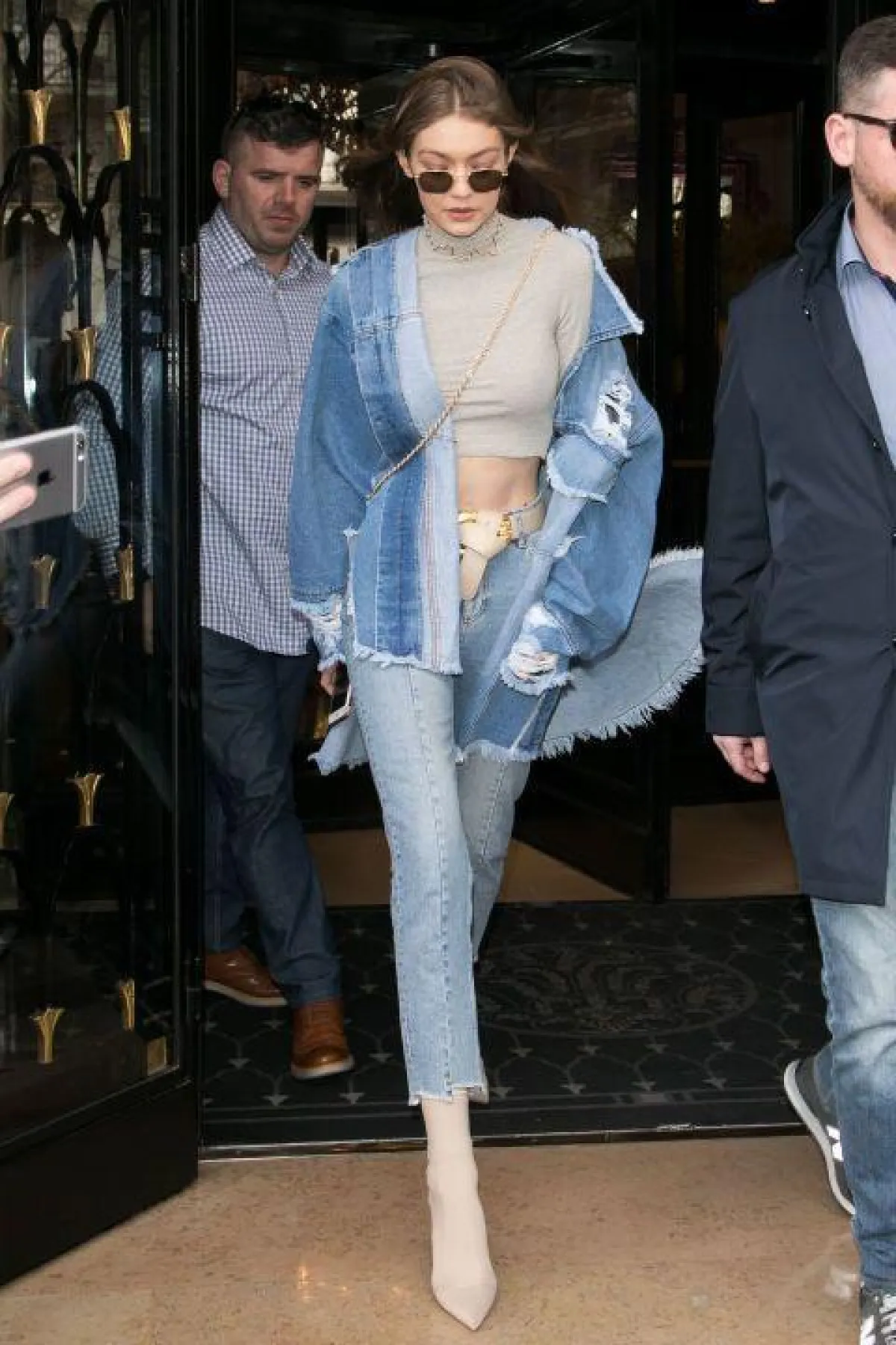 أو يمكنكِ اختياء صيحة الألبسة الممزقة من الأزياء العلوية، كاختيار جاكيت دنيم ممزّق مع بنطلون بخصر عالٍ، وحزام عريض .