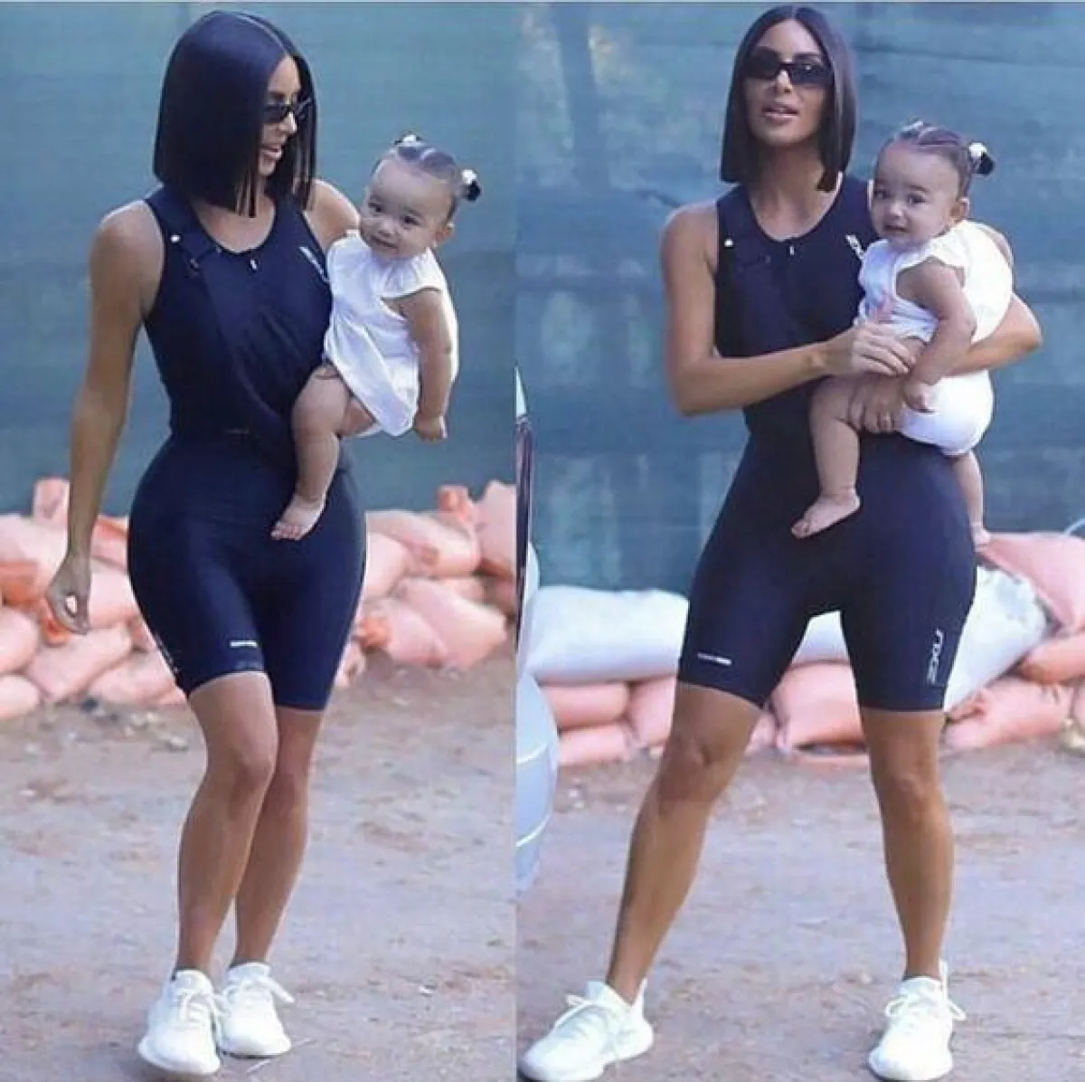 اختارت كيم كارداشيان صيحة الجمبسوت الرياضي الضيّق، الذي عكس جمال قوامها ولونها الأسمر . نسّقت كيم حذاء الـ yeezy مع اطلالتها .