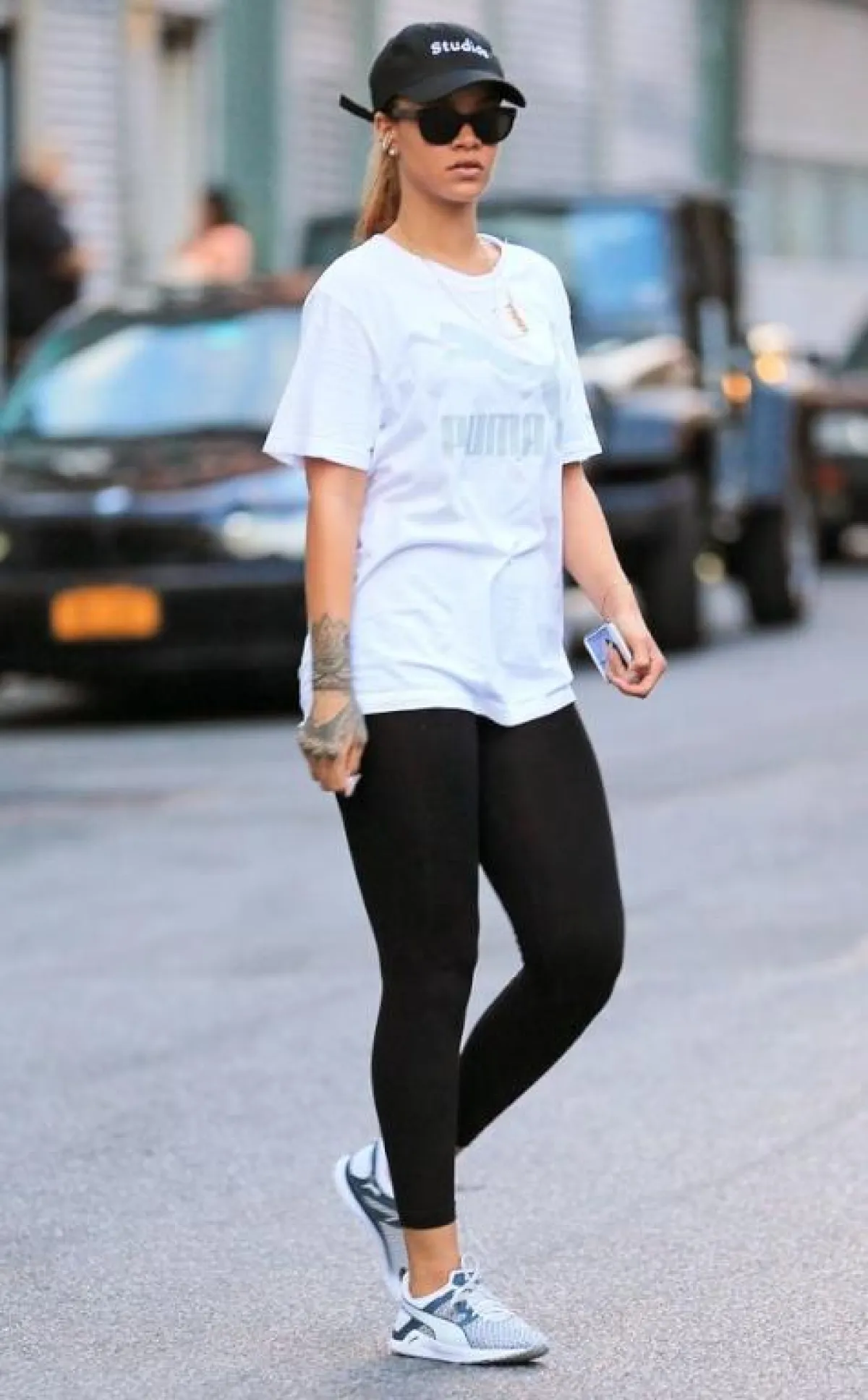 في حين راجت الأزياء الرياضية الضيّقة عند أغلب المشاهير، فضّلت المغنيّة ريهانا الظهور بأزياء رياضية فضفاضة، حيث جمعت بين فيزون أسود رياضي، وتي شيرت واسعة من علامة بوما . نسّقت اطلالتها مع حذاء رياضي من اللون الابيض والرمادي، وقبعة من اللون الأسود .