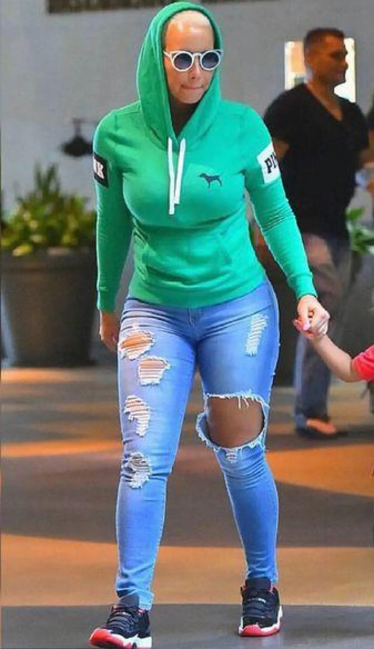 يمكنكِ اختيار اطلالة تجمع بين الأزياء الرياضية من جهة، والأزياء الكاجوال من جهة أخرى، لذلك قومي بتنسيق بلوفر hoodie مع الجينز الممزّق وحذاء رياضي، كما فعلت النجمة أمبر روز .