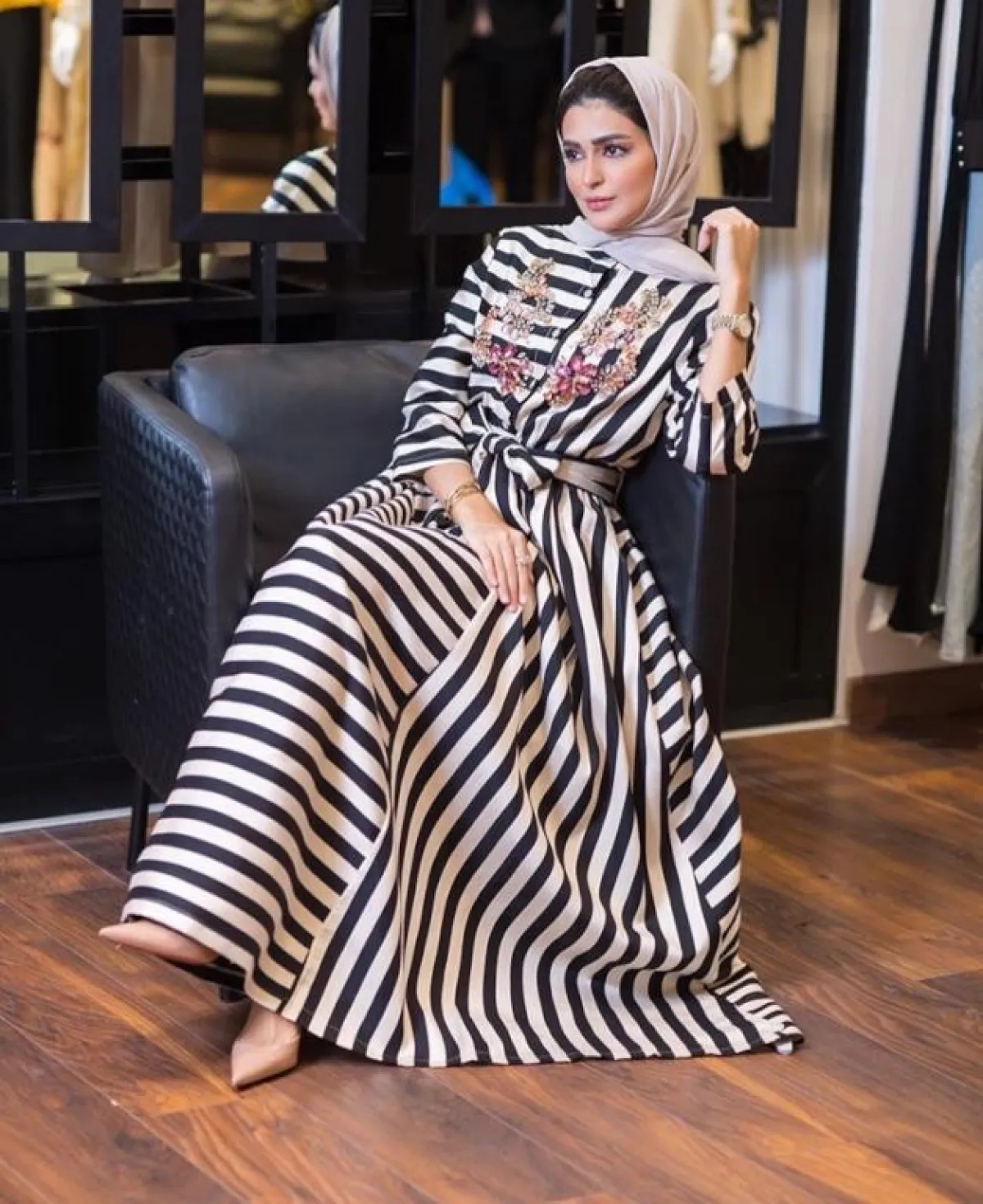 هذا الفستان الفخم المخطط بلوني الأبيض والأسود، سيبدو كلاسيكيًّا ومترفًا للغاية لسهرات عيد الفطر، مع رباط الخصر الأنيق، مع التطريزات بألوان البينك الوردية على منطقة الصدر، نسقت معه حنين الصيفي حذاءً بكعب عالٍ باللون النود، وحجابًا أنيقًا بالأبيض الثلجي للمسة غاية في الأنوثة.