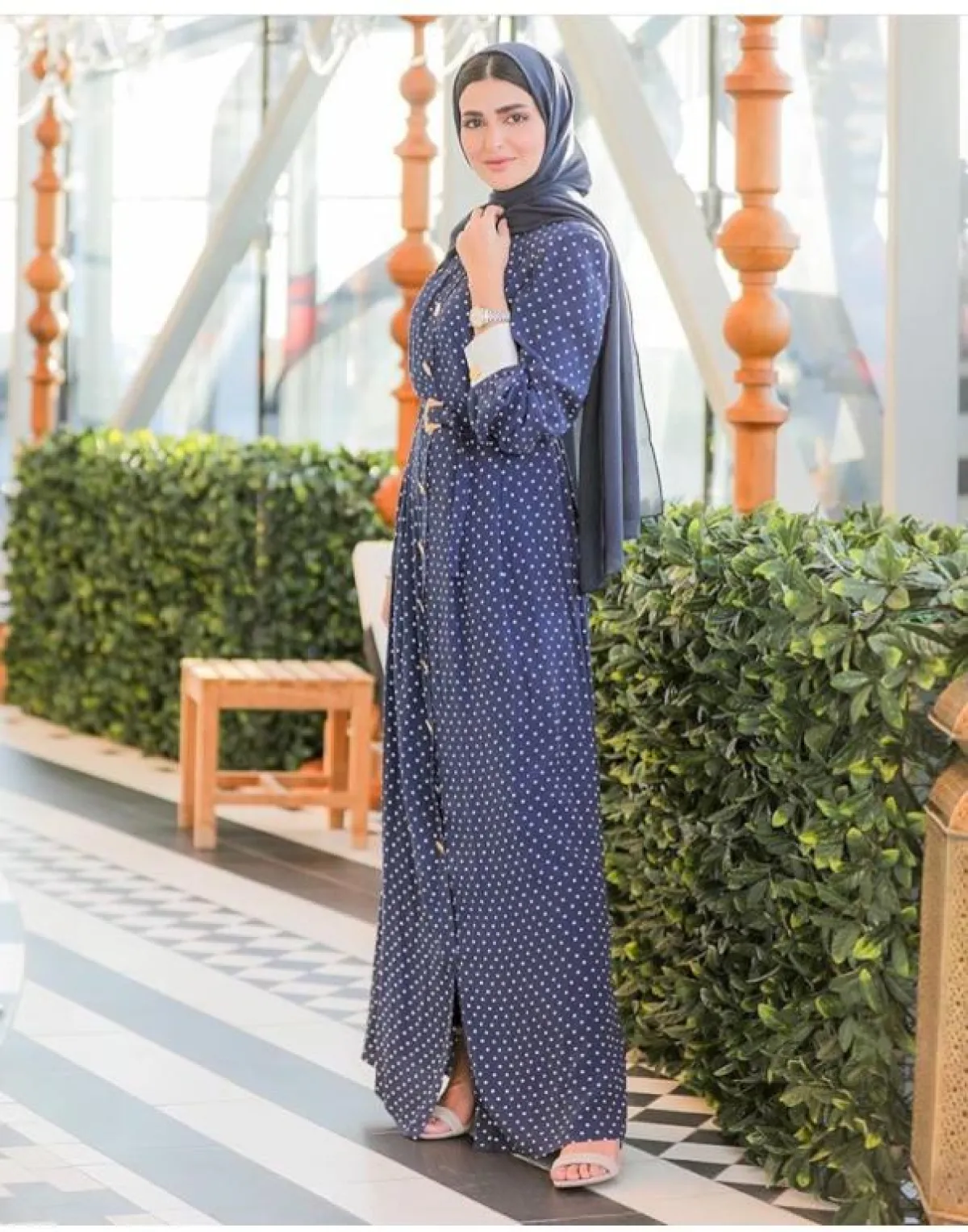 إذا كانت وجهتكِ هذا العيد أحد الأماكن الساحلية، فاختاري هذا الفستان المنقط البسيط باللون الكحلي الزاهي، نسقت معه حنين حزام الخصر وكعبًا عاليًا، من الممكن أن تضيفي لمسة صيفية بالتغيير قليلًا بستايل الحزام الكلاسيكي، مع الحذاء الخوص.