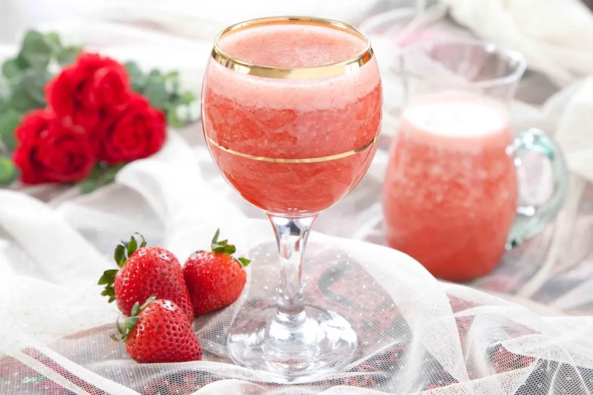 1- ضعي، في إبريق الخلاط، الفراولة والأناناس والسكر وشغّلي لتحصلي على خليط من العصير الناعم.ثم، اسكبي المياه الغازية الشفّافة.