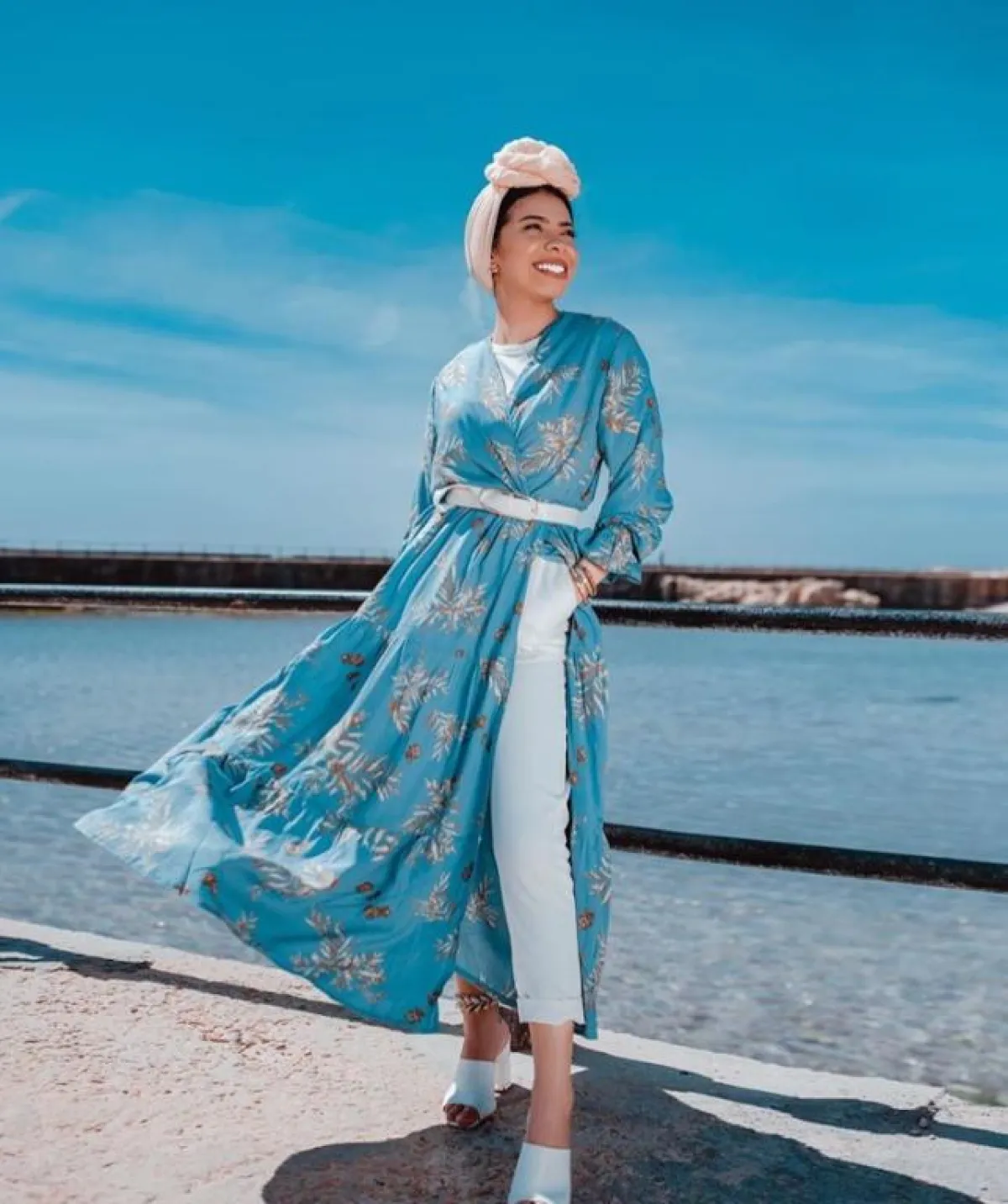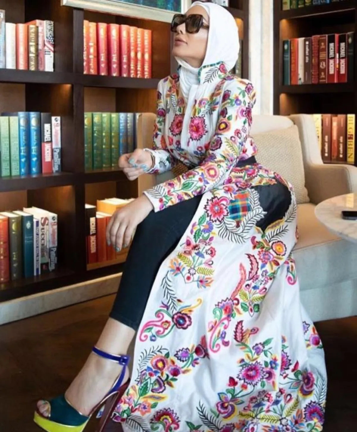 بالرغم من أنّ اطلالاتها مؤخرًا بالعبايات كانت قليلة بشكل ملحوظ، إلا أنها ألهمتنا بهذه العباية الطويلة والمفتوحة، المعرقة بالورود، وتنسيقها المميز مع البنطلون الأسود، والكعب العالي المخملي الكحلي، بإمكانكِ اعتمادها بهذه الطريقة، وتجددي العباي نفسها بتنسيق آخر، باعتماد بنطلون أبيض مثلًا، وترتديها على الشاطىء.