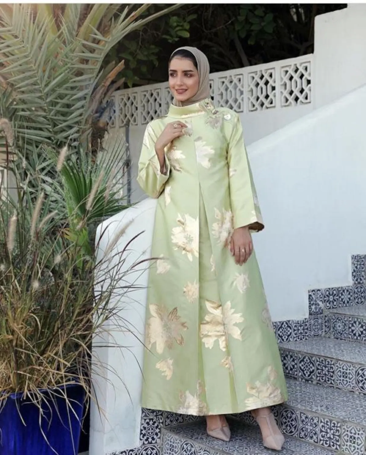 إذا كنتِ تحبين التغيير قليلًا من ستايل العبايات، فهذا التصميم من خولة المراغي مختلفة قليلًا، بخاصة مع الفتحة من المنتصف المقفولة، ولونها الهادئ، وتطريزاتها الذهبية، التي أضافت لمسة حيوية لمظهرها، مناسبة للتنسيق بألوان النود البيج، سواء باختيار الحذاء أو الشنطة.