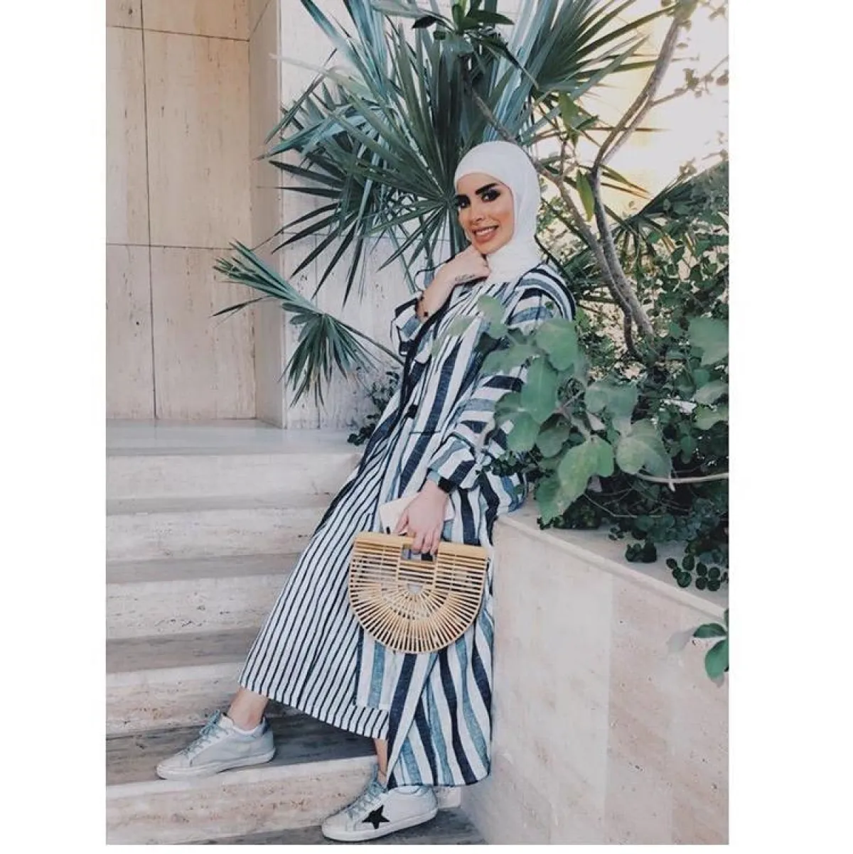 عبايات الصيف من المدونات، أصبحت أكثر بساطة ونعومة، كهذا الموديل من المدونة الخليجية زوري أشكناني، للعباية المخططة المستوحاة من الستايل البوهيمي مع خامة الكتان الناعمة، مناسبة للصبايا صاحبات الوزن المتوسط، نسقتها مع حقيبة الباسكت Basket Bag الصيفية، والسنيكر الأبيض.