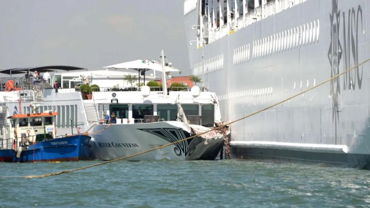 ووفقاً لصحيفة الـ«ديلي ميل» البريطانية، تنقل لكم «سيدتي» تفاصيل هذه الحادثة، التي أسفرت عن إصابة 4 سائحات من جنسيات مختلفة، كنّ على متن السفينة الضخمة، التي اصطدمت بقارب نهري سياحي في إحدى القنوات المائية المزدحمة في «فينيسيا»، وذلك خلال سقوطهن ومحاولتهن الهروب من السفينة.