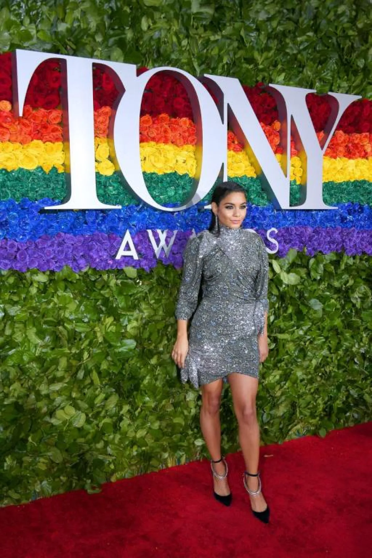 اطلالة شبابية اعتمدتها فانيسا هادجنس Vanessa Hudgens التي اختارت فستانًا قصيرًا من “التوزارا” Altuzarra مصنوعًا من قماش براق باللون الفضي، وتصميم عصري وناعم، وقد نسقت معه حذاءً بكعب عالٍ باللون الأسود، وأقراطًا طويلة.