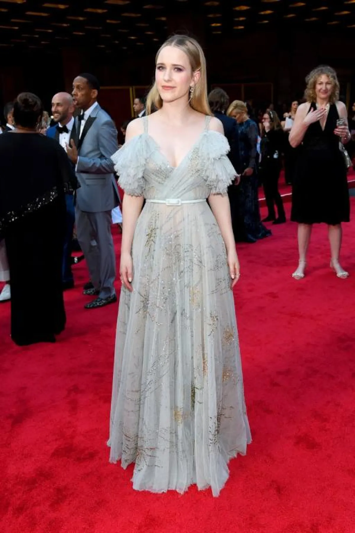 شاهدنا الممثلة الشابة “رايتشل بروسنان” Rachel Brosnahan وقد اختارت فستانًا ذا تصميم أنثوي ناعم من ديور Dior، مصنوعًا من قماش التول المطرز بحبات براقة من الخرز باللون الذهبي، أكتافة مكشوفة وأكمامه مزينة بالكشكش مع حزام رفيع على الخصر.