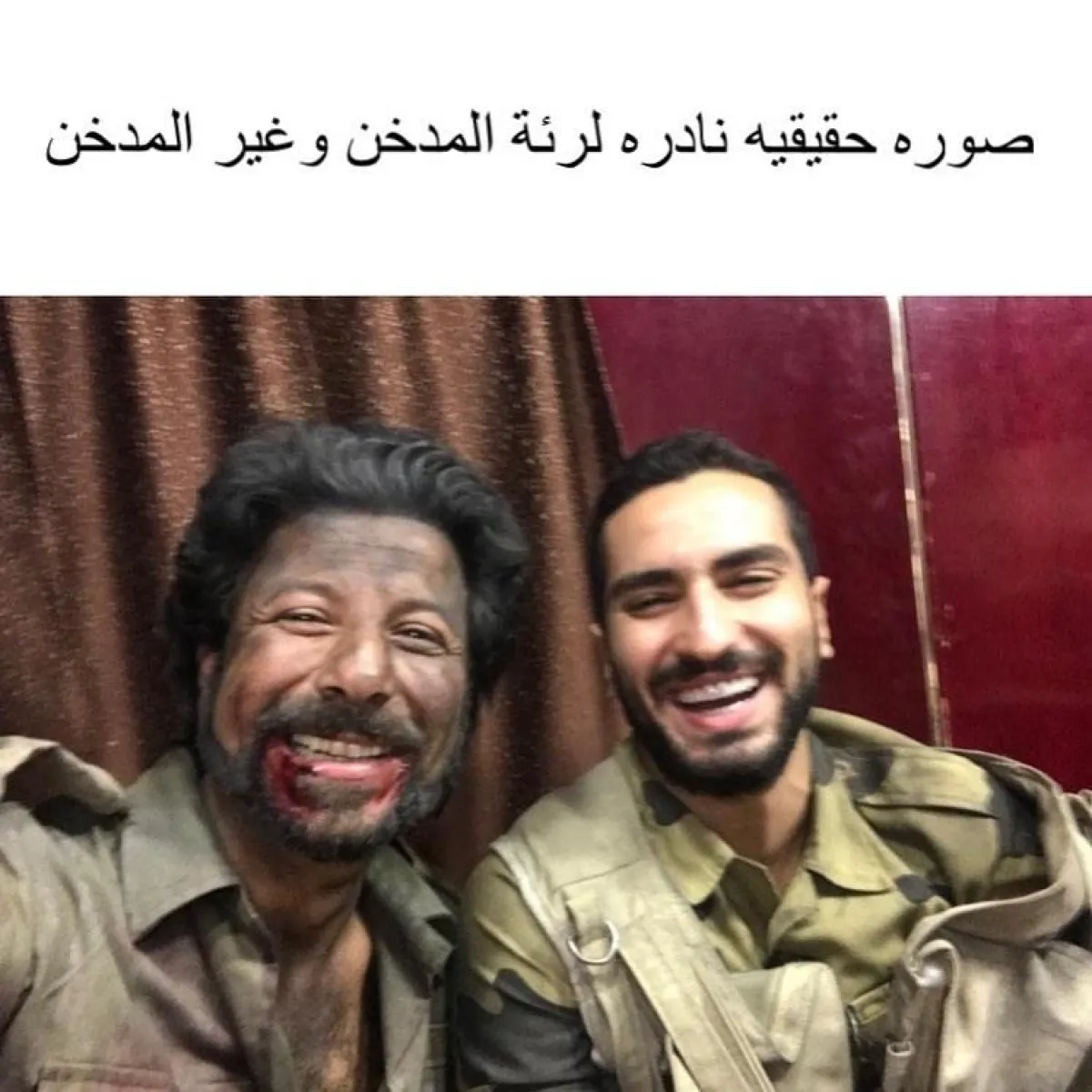 وكافح إياد نصار من خلال هذه الصور، التدخين، من خلال تعليقه الساخر على الصورة قائلًا :"صورة نادرة بين رئة المدخن وغير المدخن"، حيث ظهر ووجهه مملوء بمادة سوداء نتجت عن تفجير قاموا بتنفيذه في أحد مشاهد الفيلم، فيما ظهر محمد الشرنوبي بوجهه الطبيعي، وتفاعل الكثيرون من محبي إياد مع الصور أشادوا بفكرته التي قدمها من خلال الصورة .