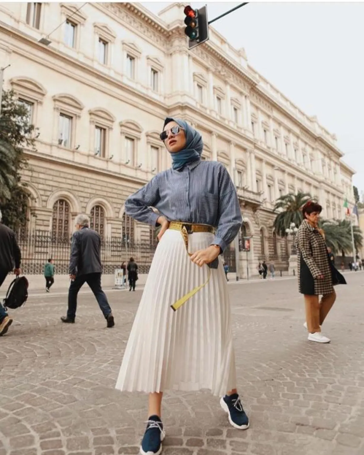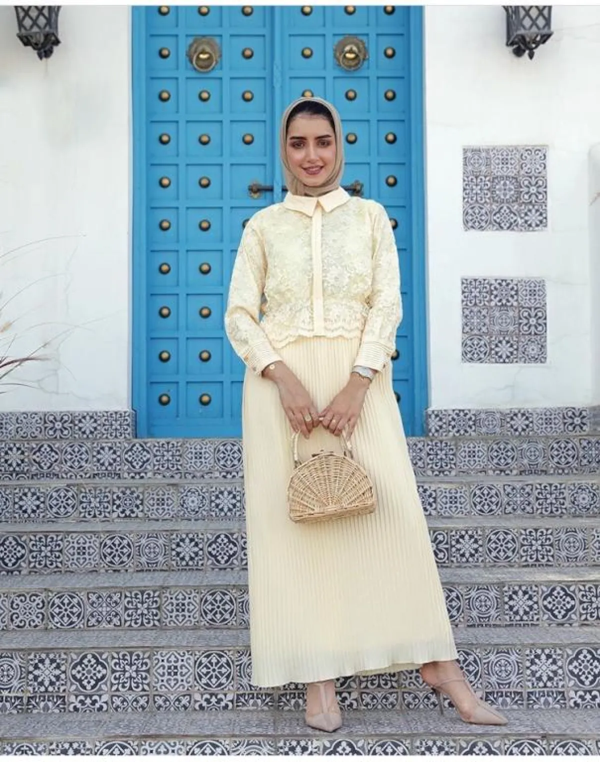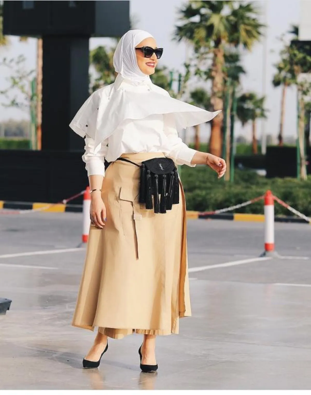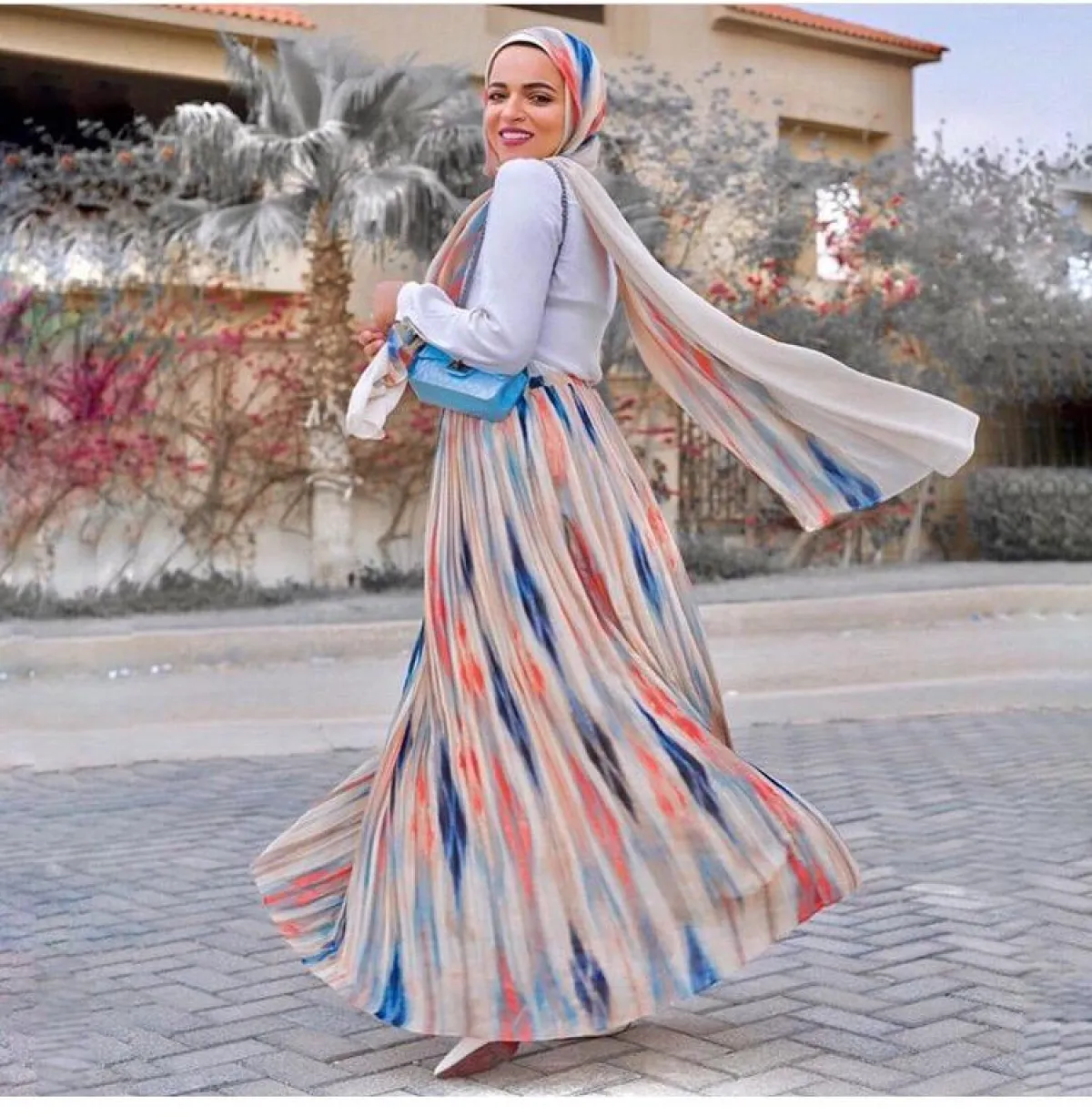 اعتمدت المدونة المصرية سهر فؤاد على تنورة ملونة صيفية منفوشة، نسقت معها قميصا أبيض كلاسيكيا، ولفتنا اختيارها للـ حجاب الطويل بنفس ألوان وخامة التنورة، لإطلالة لافتة للأنظار، نسقت معها شنطة ميني بدرجة البيبي بلو، مستوحاة من ألوان التنورة، لإطلالة تجمع بين النمطين العصري والكلاسيكي.