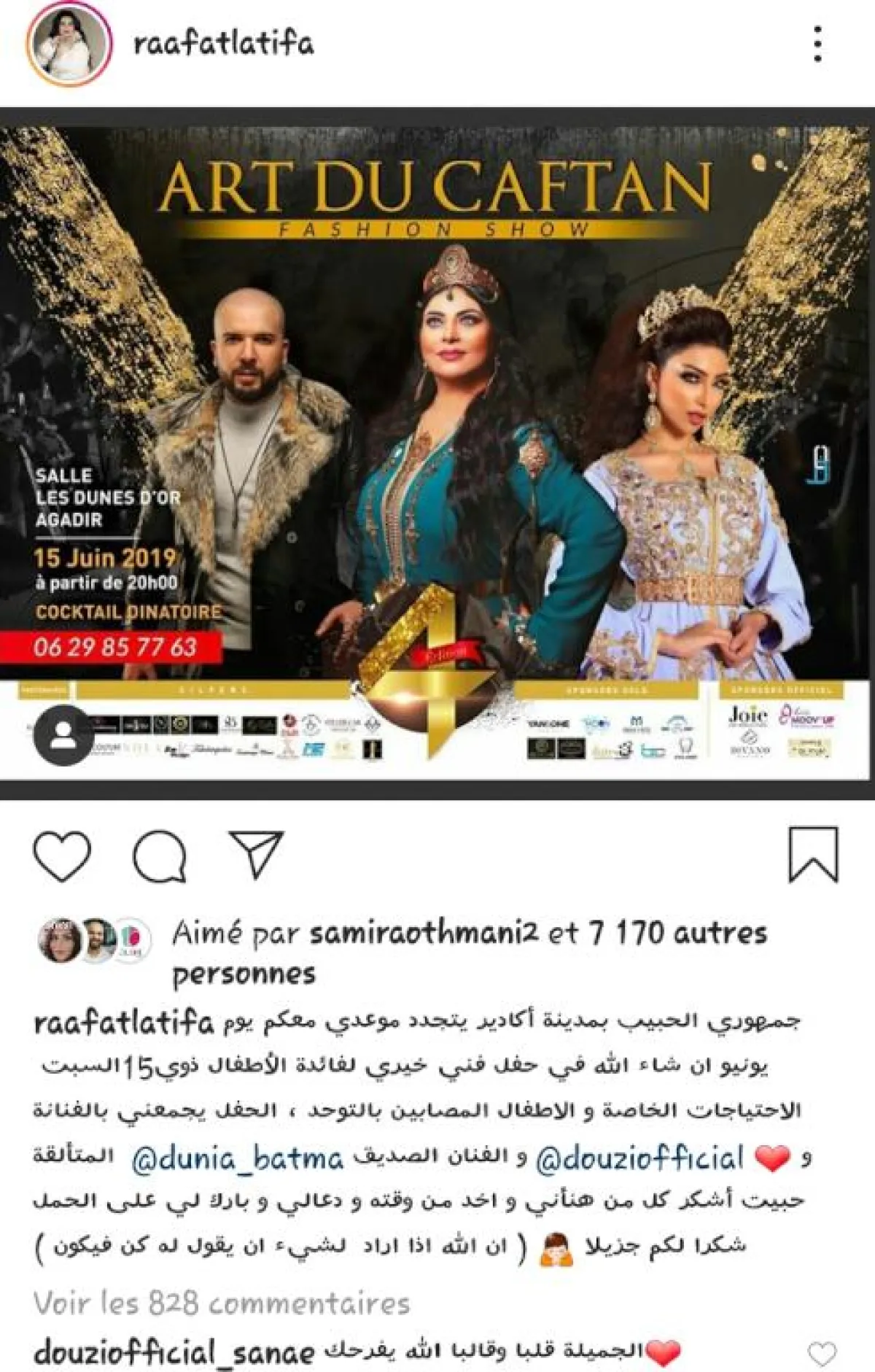 ووجهت "لطيفة رأفت" تدوينة عبر حسابها الرسمي على تطبيق الصور والفيديوهات" الإنستغرام"، تشكر فيه كل من قام بتهنأتها بخصوص الحمل وكتبت: "جمهوري الحبيب بمدينة أكادير، تجدد موعدي معكم يوم السبت 15 يونيو ان شاء الله في حفل فني خيري لفائدة الأطفال ذوي الاحتياجات الخاصة و الاطفال المصابين بالتوحد، الحفل يجمعني مع الفنانة المتألقة "دنيا بطمة" والفنان الصديق "الدوزي"، و حبيت أشكر كل من هنأني و أخد من وقته و دعالي و بارك لي على الحمل شكرا لكم جزيلا، ان الله اذا أراد لشيء أن يقول له كن فيكون".