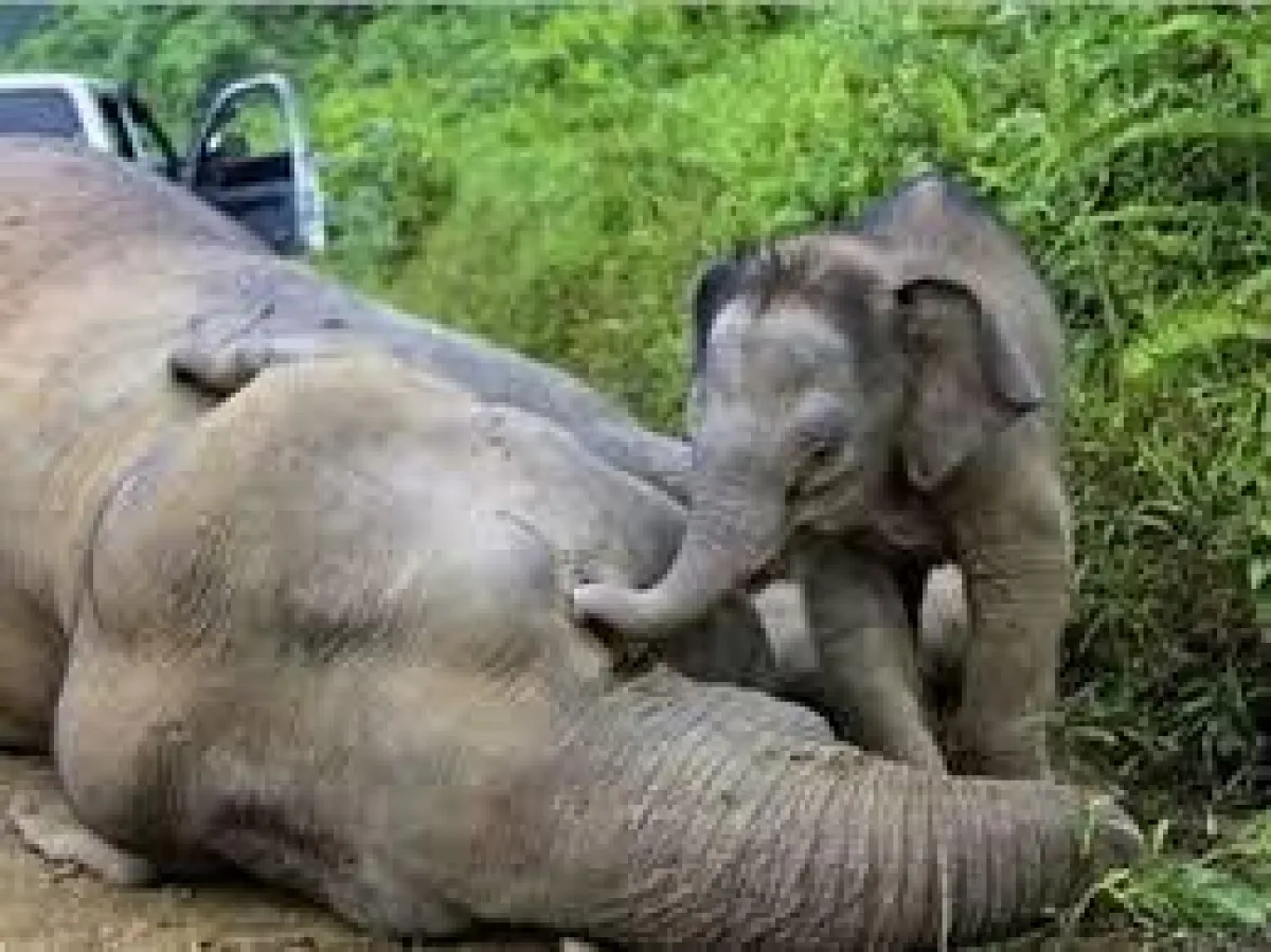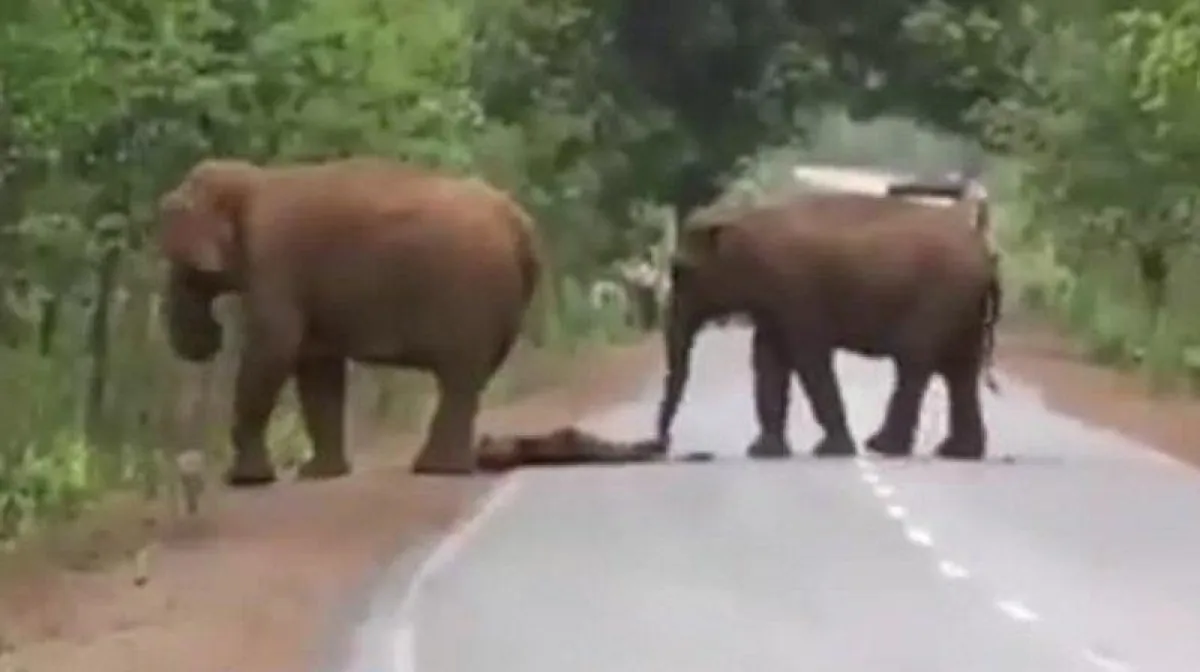 كما أظهر الفيديو الذي تم بثه على موقع "يوتيوب" أم الفيل الصغير وهي تحمل جثة صغيرها، وتعبر بها الطريق، ثم تضعها على الأرض، وتنتظر حتى يلحق بها قطيع من ثمانية أفيال بينهم ثلاثة صغار، ومن بعدها يتحرك الجميع داخل الغابة، وربما إلى مقبرة يضعون فيها الصغير.