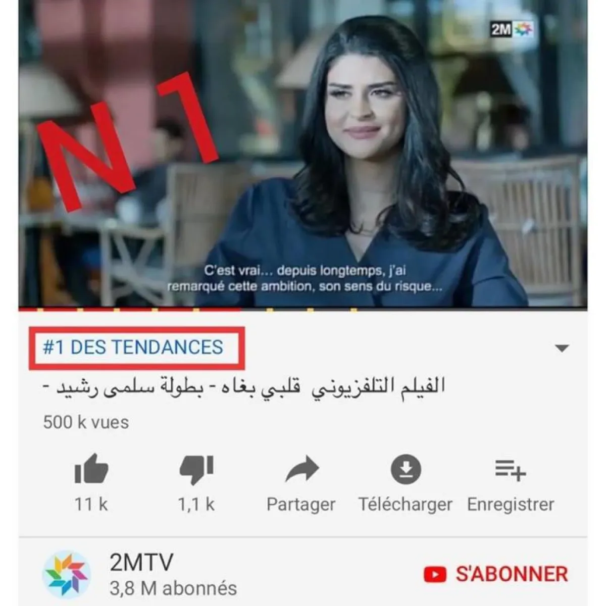 سلمى نشرت تدوينة على صفحتها في فيسبوك، والتي يتابعها عليها ما يزيد عن مليون و700 ألف متابع، كتبت فيها: "الحمد لله بعد تصدّر جينيريك فيلم "قلبي بغاه" المرتبة الأولى على التراند باليوتوب. الفيلم الآن وبعد أن حقق نسب مشاهدة عالية على تلفزيون القناة الثانية بحسب إحصائيات القناة الثانية.. يتصدر التراند (الطوندونس) المغربي بالمرتبة الأولى على اليوتوب في يوم واحد فقط".