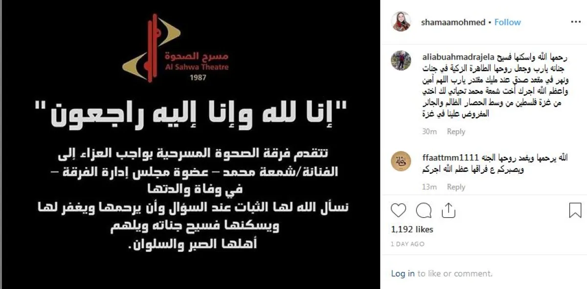 كما علقت على بطاقة تعزية أُرسلت لها من فرقة الصحوة المسرحية وقالت: (شكرًا لفرقة الصحوة المسرحية على التعزية والمواساة بوفاة والدتي الله يرحمها ويغفر لها .. إنا لله وإنا إليه راجعون).
