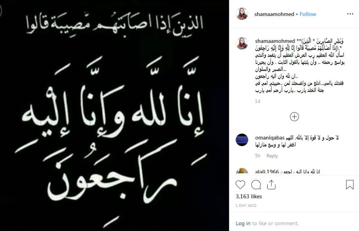 عبر حسابها على تطبيق الإنستقرام أعلنت الفنانة العمانية شمعة محمد عن وفاة والدتها، حيث نعتها قائلة: (وَبَشِّرِ الصَّابِرِينَ الَّذِينَ إِذَا أَصَابَتْهُمْ مُصِيبَةٌ قَالُوا إِنَّا لِلَّهِ وَإِنَّا إِلَيْهِ رَاجِعُونَ). اسأل الله العظيم رب العرش العظيم أن يتغمد والدتي بواسع رحمته .. وأن يثبتها بالقول الثابت وأن يجيرنا الصبر والسلوان.